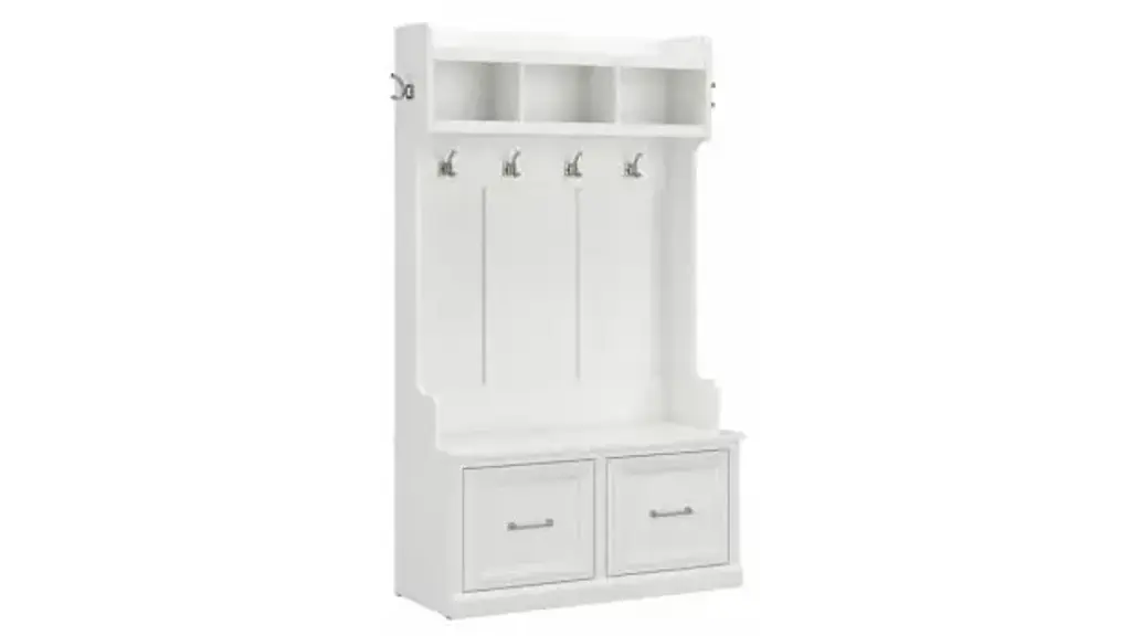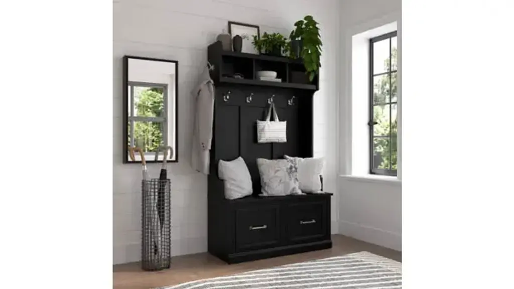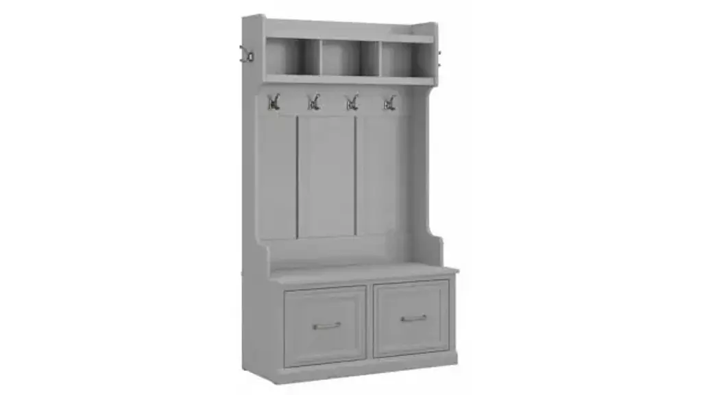 The Bush Furniture Woodland 40" W Hall Tree and Shoe Storage Bench with Doors combines transitional styling and a practical design to offer an ideal entryway organizer. Have a seat on the durable bench surface and take a moment to relax as you get ready to head out the door or come home after a long day. The top of the mudroom bench supports up to 250 lbs, so you can sit down to put on and take off your shoes or set shopping bags down after a trip to the store with confidence. Cabinet doors with smooth Euro-style hinges conceal two internal compartments that keep footwear in order and out of sight. The Hall Tree includes four Weathered Nickel coat hooks in the front and one on each side for hanging jackets, hats, scarves and more. Smaller items like gloves and keys can be stashed neatly inside three open cubby spaces, and the top shelf provides an area to brighten up your entryway with decorations. The shoe bench's transitional design blends elements of contemporary and traditional styling to complement a wide range of home furnishings while your choice of several attractive finish options make it easy to find the perfect look for your space. This entryway bench with storage has been rigorously tested to meet Bush Furniture's standards for safety, performance. See the full Woodland Collection to complete your home's entryway, mudroom or foyer with style. Overall Dimensions: 39.75" W x 17.5" D x 69.38" H Ships ready for easy assembly.