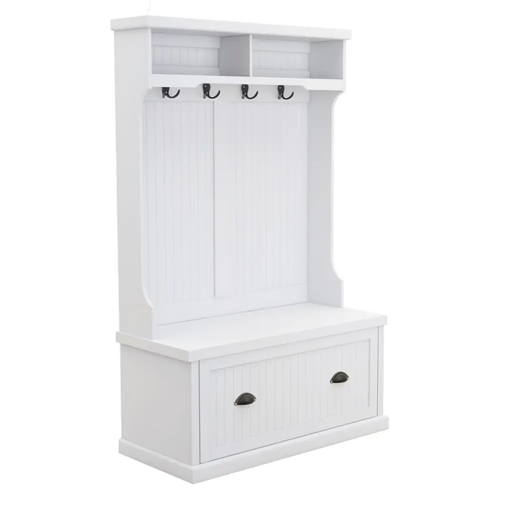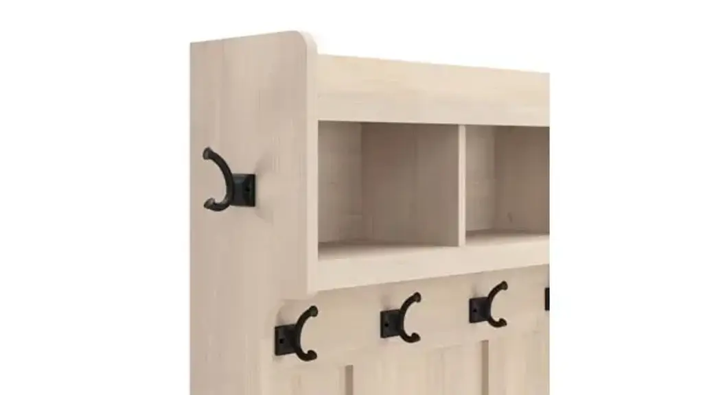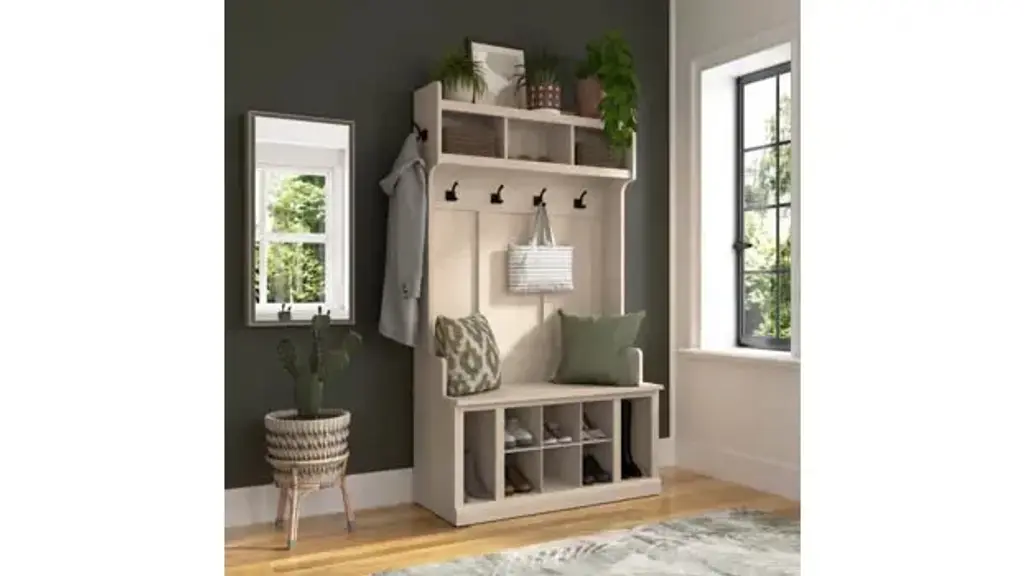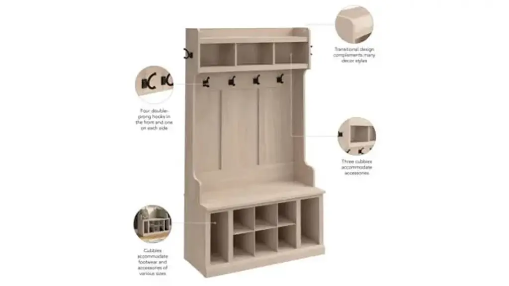 The Bush Furniture Woodland 40" W Hall Tree and Shoe Storage Bench with Shelves combines transitional styling and a practical design to offer an ideal entryway organizer. Have a seat on the durable bench surface and take a moment to relax as you get ready to head out the door or come home after a long day. The top of the mudroom bench supports up to 250 lbs, so you can sit down to put on and take off your shoes or set shopping bags down after a trip to the store with confidence. Open storage that includes six cubby spaces and vertical shelves on either side keeps footwear of all shapes and sizes in order. The Hall Tree features four Weathered Nickel coat hooks in the front and one on each side for hanging jackets, hats, scarves and more. Smaller items like gloves and keys can be stashed neatly inside three open compartments, and the top shelf provides an area to brighten up your entryway with decorations. The shoe bench's transitional design blends elements of contemporary and traditional styling to complement a wide range of home furnishings while your choice of several attractive finish options make it easy to find the perfect look for your space. This entryway bench with storage has been rigorously tested to meet Bush Furniture's standards for safety, performance. See the full Woodland Collection to complete your home's entryway, mudroom or foyer with style. Overall Dimensions: 39.75" W x 17.5" D x 69.38" H Ships ready for easy assembly.