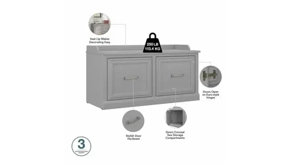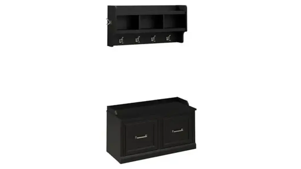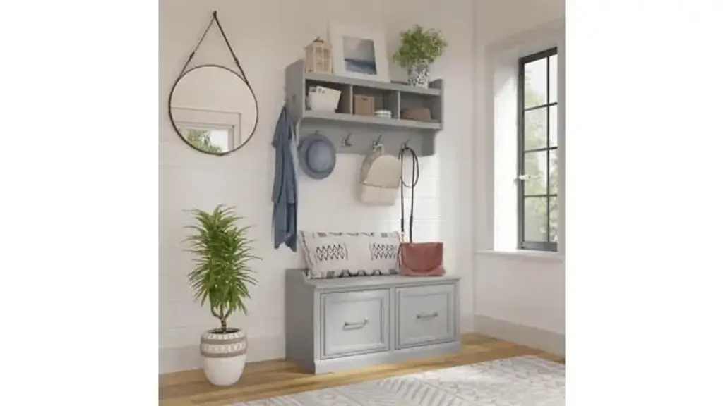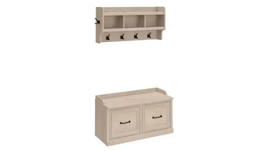 Bush Furniture Woodland 40"W Shoe Storage Bench with Doors and Wall Mounted Coat Rack combines transitional styling and a practical design to offer an ideal entryway organizer. Have a seat on the durable bench surface and take a moment to relax as you get ready to head out the door or come home after a long day. The top of the mudroom bench supports 250 lbs., so you can sit down to put on and take off your shoes or set shopping bags down after a trip to the store with confidence. Cabinet doors with smooth Euro-style hinges conceal two internal compartments that keep footwear in order and out of sight. The wall shelf includes six Weathered Nickel coat hooks for hanging jackets, hats, scarves and more. Smaller items like gloves and keys can be stashed neatly inside three open cubby spaces, and the top shelf provides an area to brighten up your entryway with decorations. The shoe bench and wall mounted shelf's transitional design blends elements of contemporary and traditional styling to complement a wide range of home furnishings while your choice of finish options make it easy to find the perfect look for your space. This entryway bench and coat rack has been rigorously tested to meet Bush Furniture's standards for safety, performance and durability. See the full Woodland Collection to complete your home's entryway, mudroom or foyer with style. Overall Dimensions: 39.72"W x 17.44"Dx 21.02"H. Ships ready for easy assembly.
