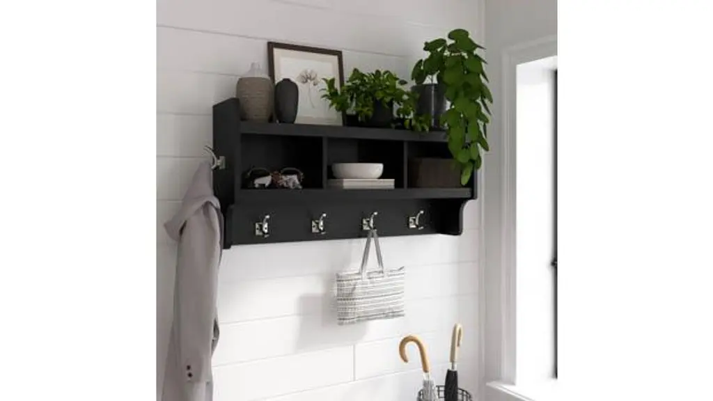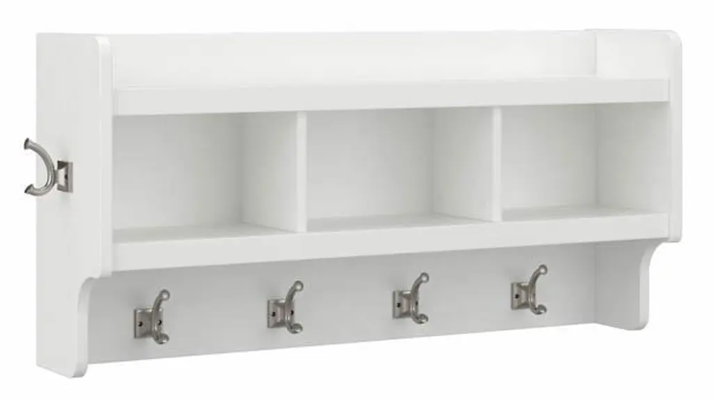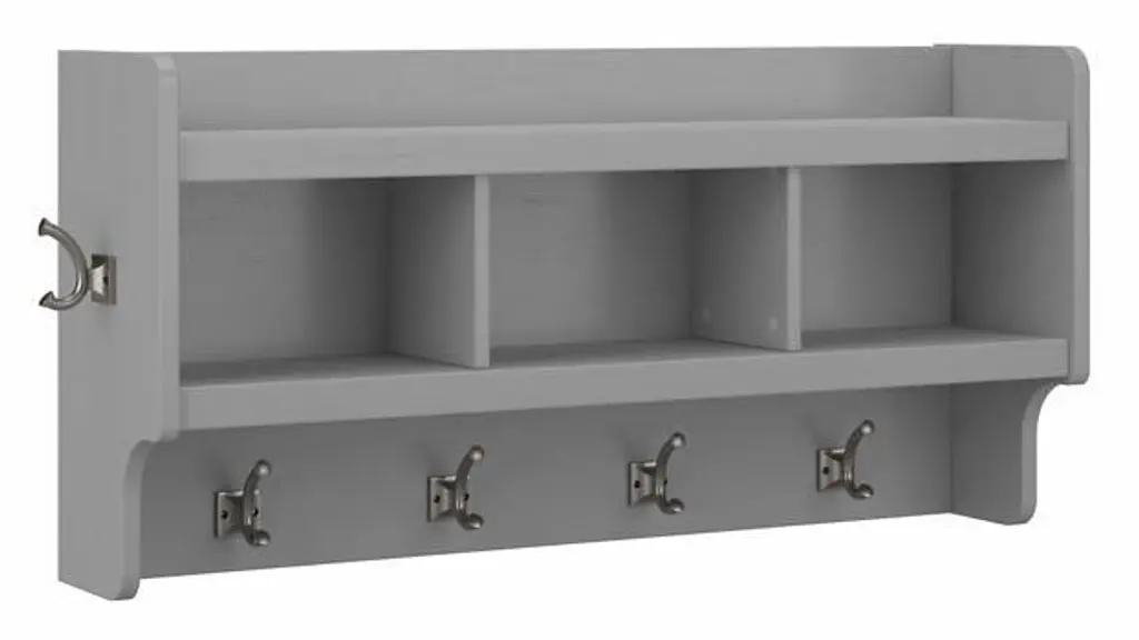 The Bush Furniture Woodland 40" W Wall Mounted Coat Rack with Shelf combines transitional styling and a practical design to offer an ideal entryway organizer. Store outerwear and other daily essentials in one convenient location so that everything is right where you need it when it's time to head out the door again. The wall shelf includes four Weathered Nickel coat hooks in the front and one on each side for hanging jackets, hats, scarves and more. Smaller items like gloves and keys can be stashed neatly inside three open cubby spaces while the top shelf provides an area to brighten up your entryway with decorations. Coat hooks support up to 15 lbs, and the total weight capacity of the wall mounted shelf is 25 lbs. The wall coat rack's transitional design blends elements of contemporary and traditional styling to complement a wide range of home furnishings while your choice of several attractive finish options make it easy to find the perfect look for your space. This entryway wall organizer has been rigorously tested to meet Bush Furniture's standards for safety, performance. See the full Woodland Collection to complete your home's entryway, mudroom or foyer with style. Overall Dimensions: 39.5" W x 9.90" D x 19.5" H Ships ready for easy assembly.
