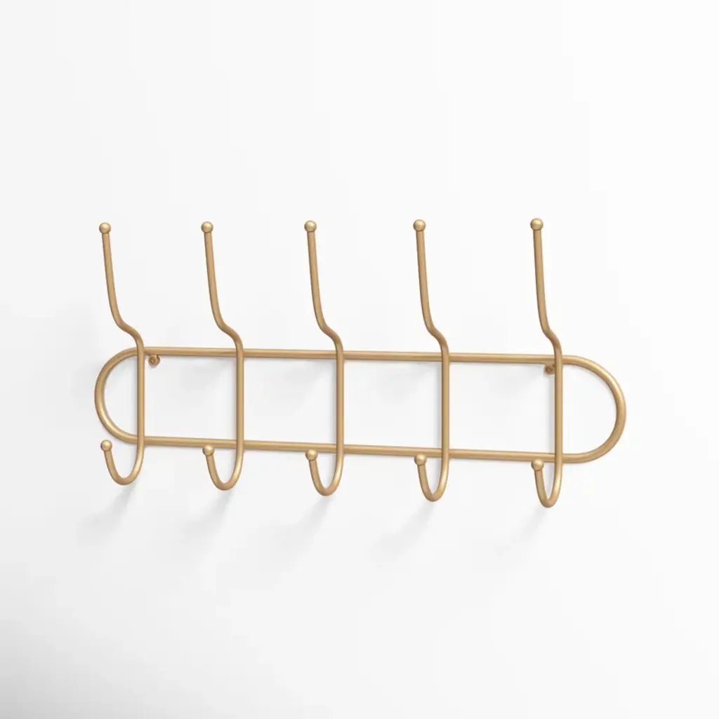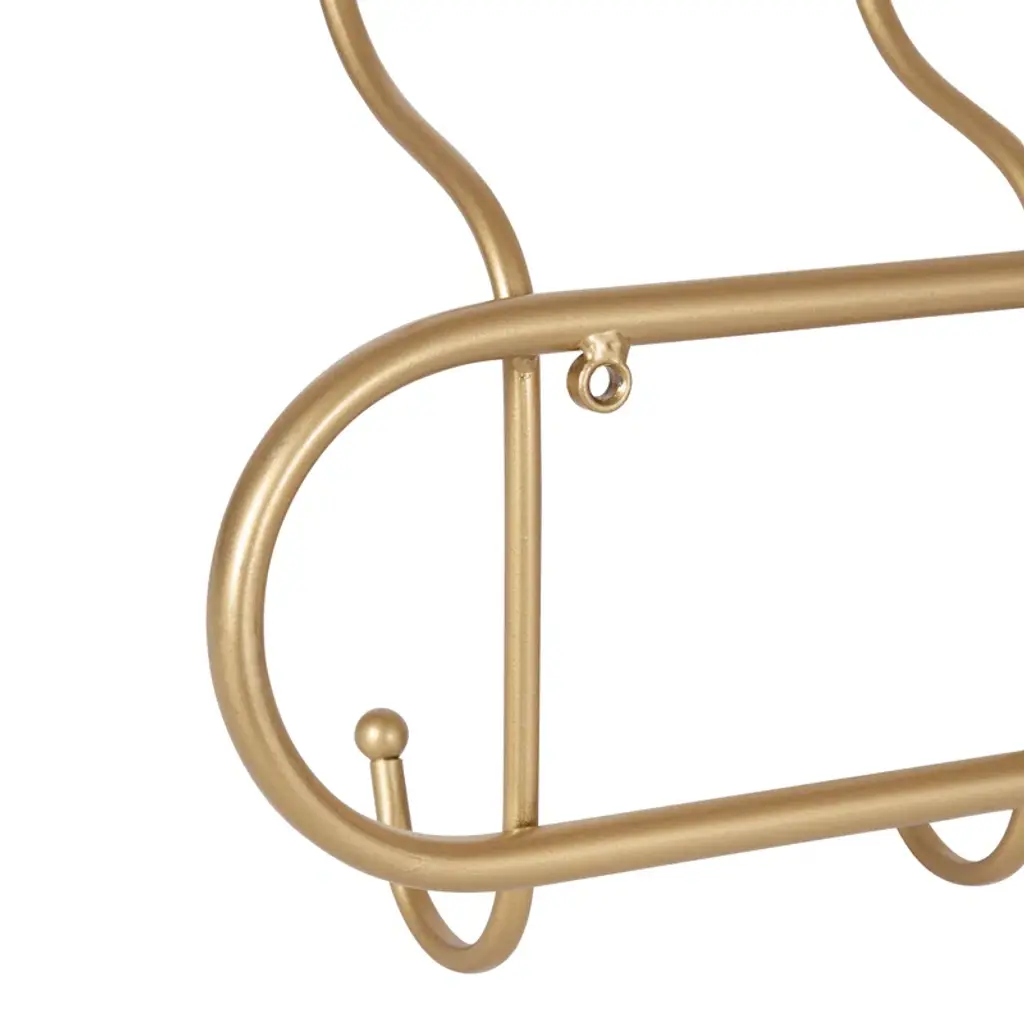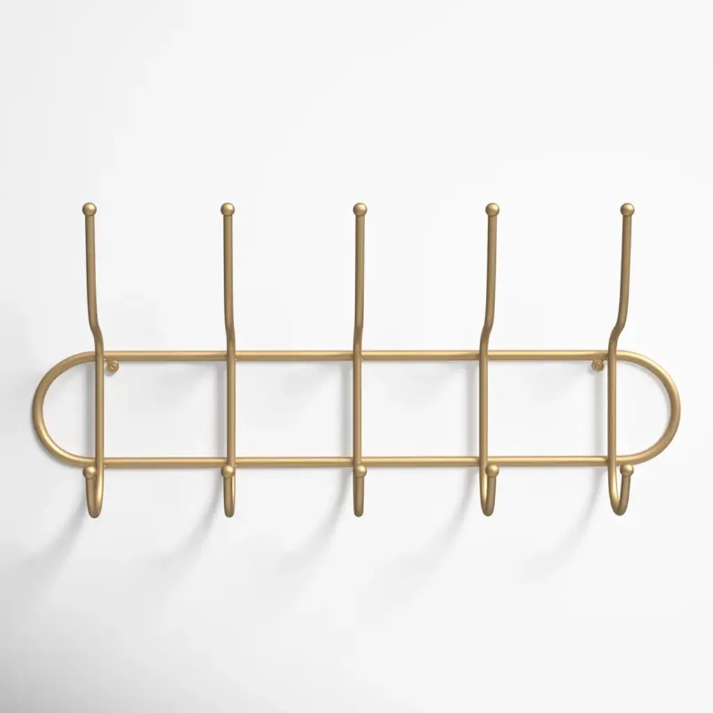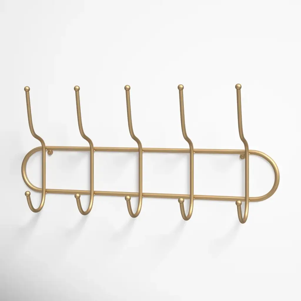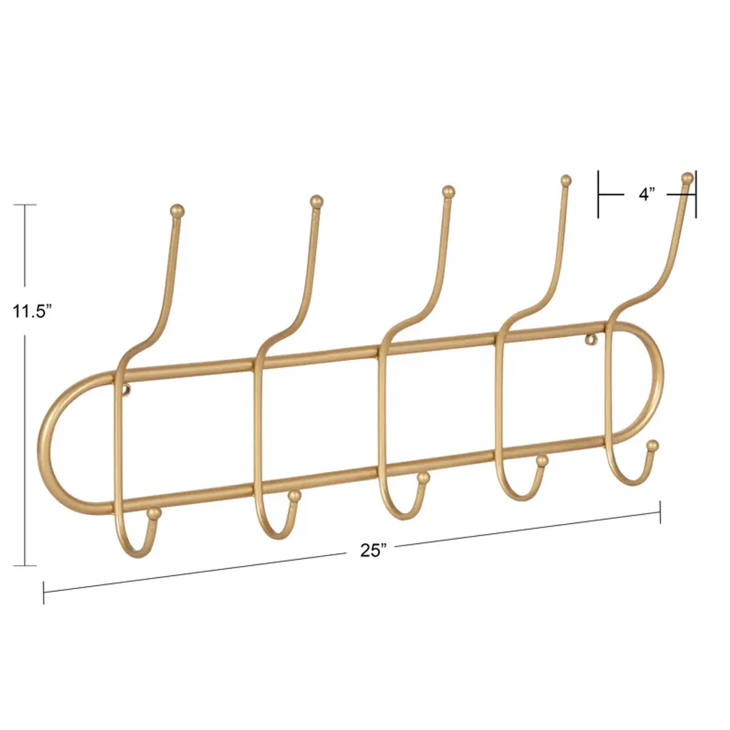 Say hello to organized bliss with this wall-mounted coat rack! Crafted from sturdy metal with a chic gold finish, it introduces a touch of boho glam to any space. It's decked out with five double-sided hooks, offering ten places to hang up your everyday essentials. From light jackets to pet leashes, this versatile piece has got you covered. It's compact, measuring 25 inches wide by 4 inches deep by 11.5 inches tall, ensuring it’ll fit snugly without overbearing your wall space. Plus, installation is a breeze with the attached metal eyelet hangers.