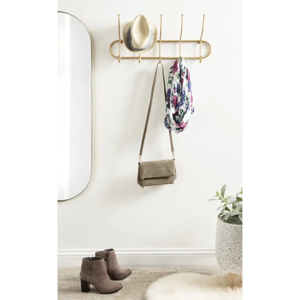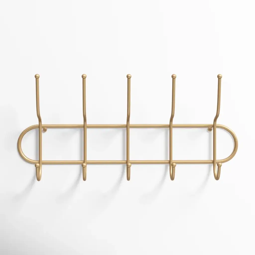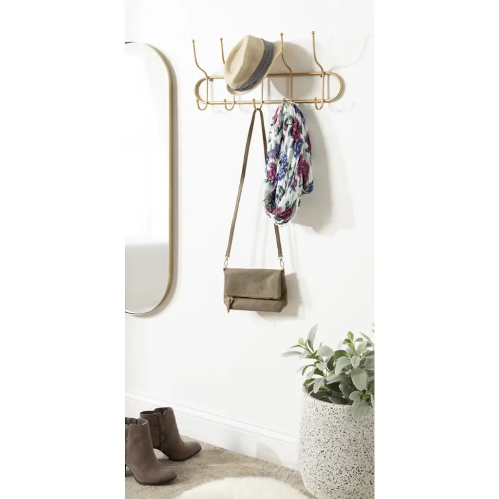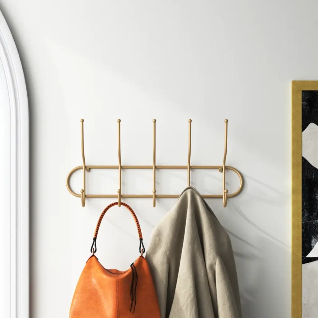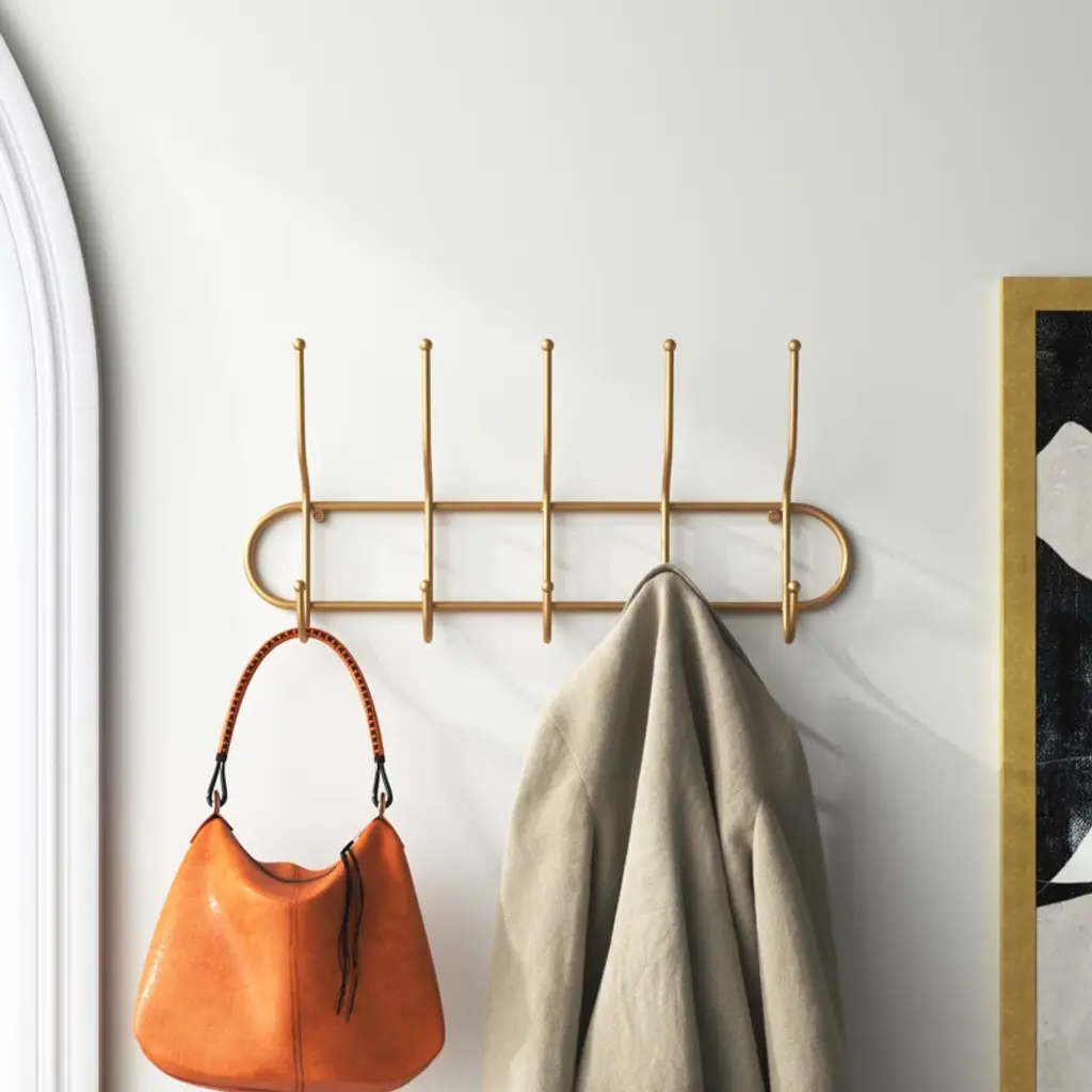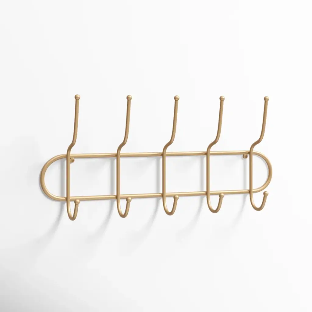 Say hello to organized bliss with this wall-mounted coat rack! Crafted from sturdy metal with a chic gold finish, it introduces a touch of boho glam to any space. It's decked out with five double-sided hooks, offering ten places to hang up your everyday essentials. From light jackets to pet leashes, this versatile piece has got you covered. It's compact, measuring 25 inches wide by 4 inches deep by 11.5 inches tall, ensuring it’ll fit snugly without overbearing your wall space. Plus, installation is a breeze with the attached metal eyelet hangers.