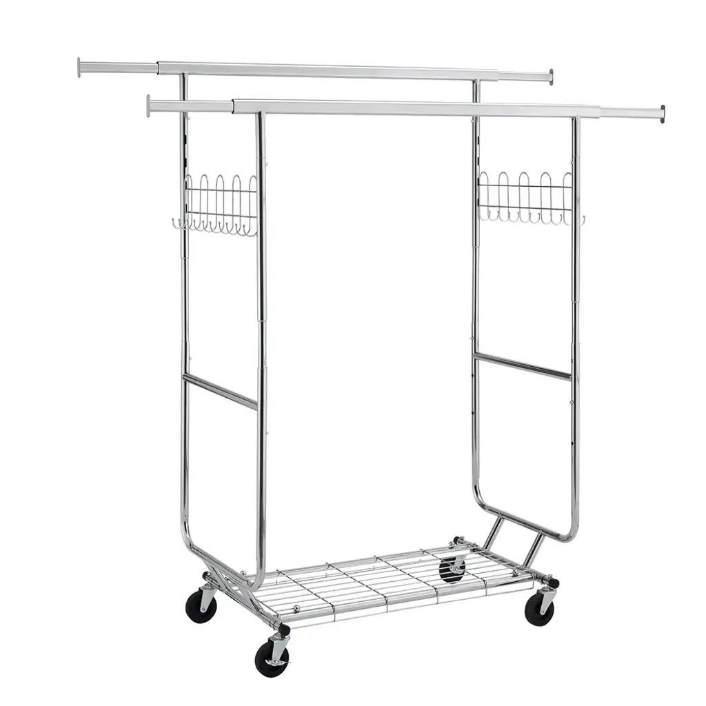 This black coat rack, made of carbon steel, measures 47.2x17.7x78.7 inches. It features two-layer mesh panels, double crossbars, two support bars with 4 hooks each, and a powder coating. Layer spacing is freely adjustable for versatile use.