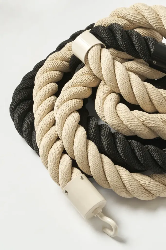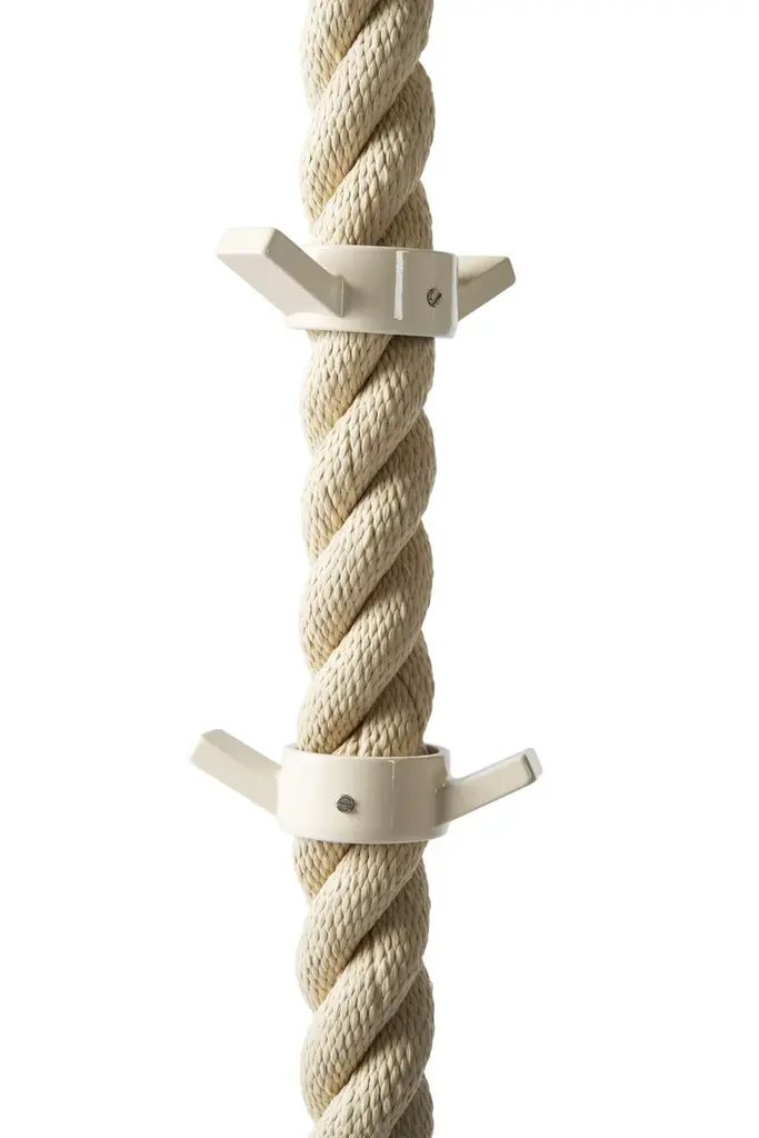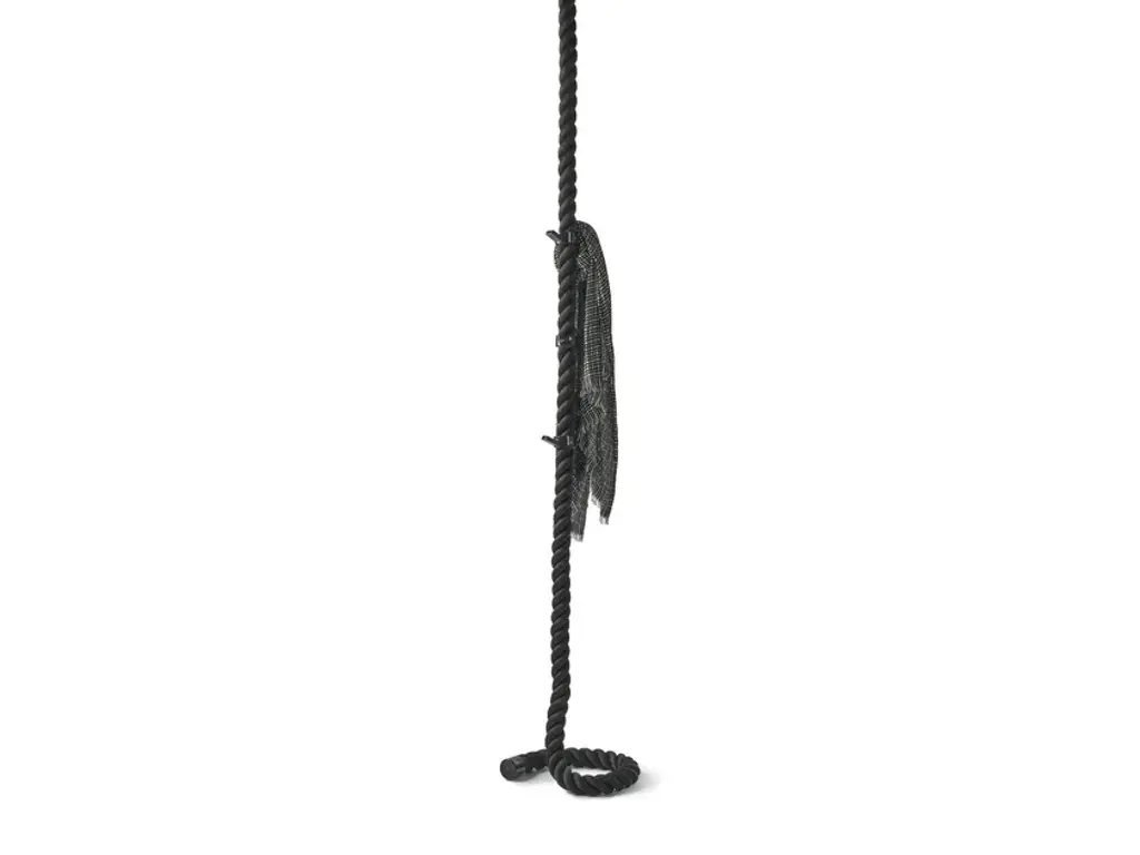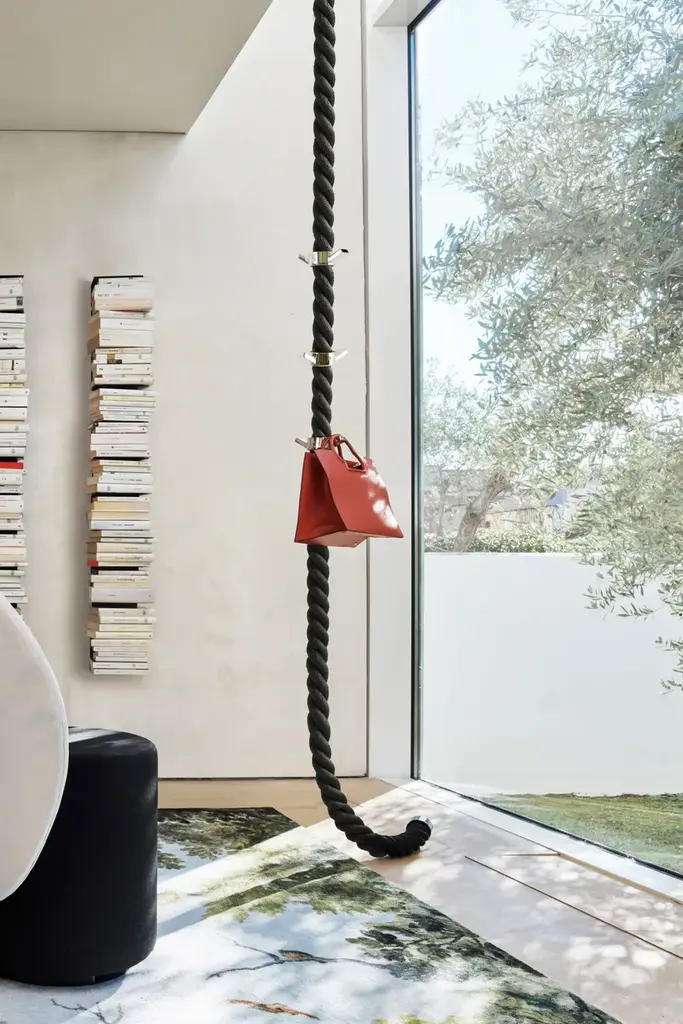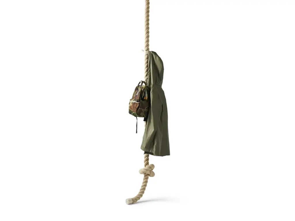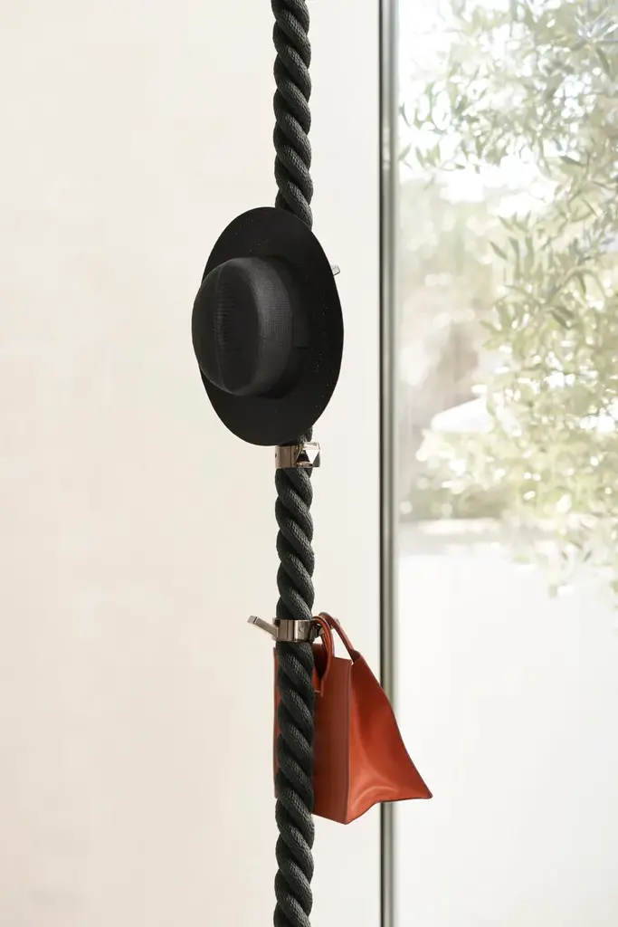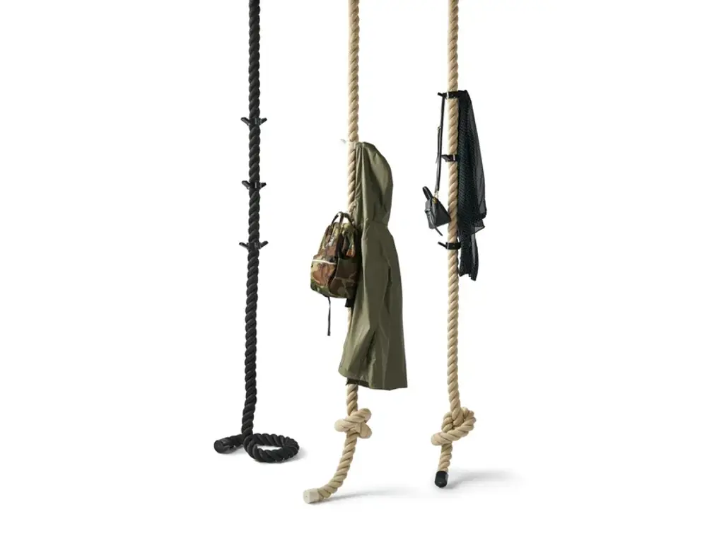 La Cima is a wall or ceiling-mounted coat rack in plaited nautical rope with metal hardware. Three rings, two hangers each.Rope finishes: black, natural beige.Metal hardware finishes: black lacquer, beige lacquer, galvanised chrome and 24k gold plating.Accessories: wall or ceiling anchorage hardware in metal with matching finish.La Cima by Lapo Ciatti embodies the idea of ready-made in design. The traditional braided nautical rope is reinterpreted into an innovative and appealing coat rack.Hanging from the ceiling or the wall using special hooks, the rope combines with three rings to become a coat rack, as original as it is functional. A furniture accessory where shape takes centre stage without compromising on ease of use and can turn an everyday action into an unforgettable experience, like all real design objects do.At home, in the office, in a bar or in a hotel hall, La Cima takes up very little room and is the perfect solution for any environment, including living rooms, waiting rooms, bedrooms, and even bathrooms and kitchens.