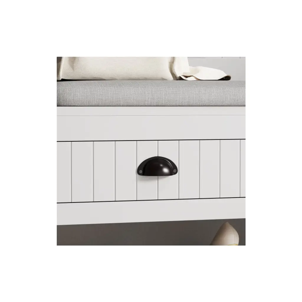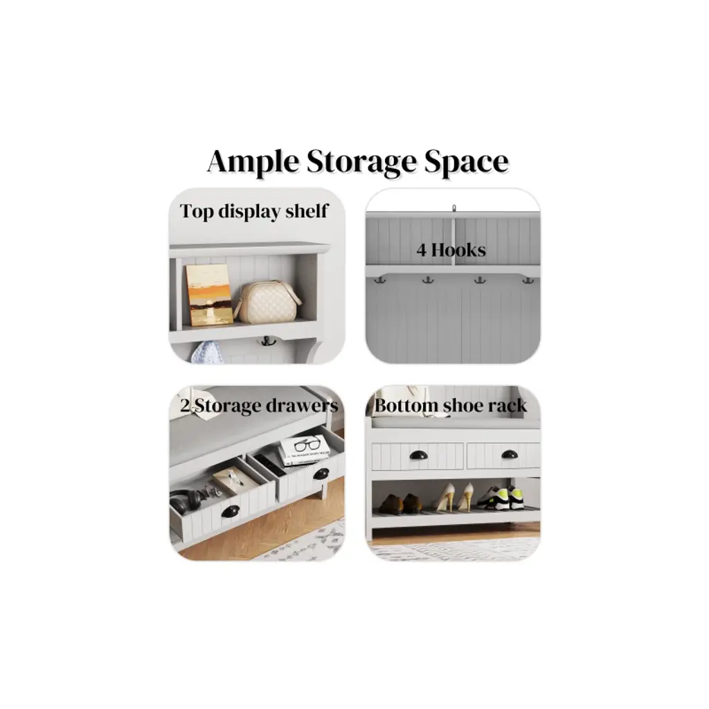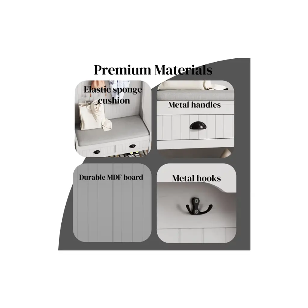 Elastic Sponge Cushion It is filled with high-quality sponge with good resilience, allowing you to change your shoes and get a comfortable experience when resting 2 Storage Drawers 2 slide drawers keep your foyer organized with the essentials you need to go out 4 Metal Hooks 4 metal hooks to hang your clothes, bags, hats and more 2 Storage Top Shelves The two storage shelves on the top can be used to store potted plants, bags, books, etc