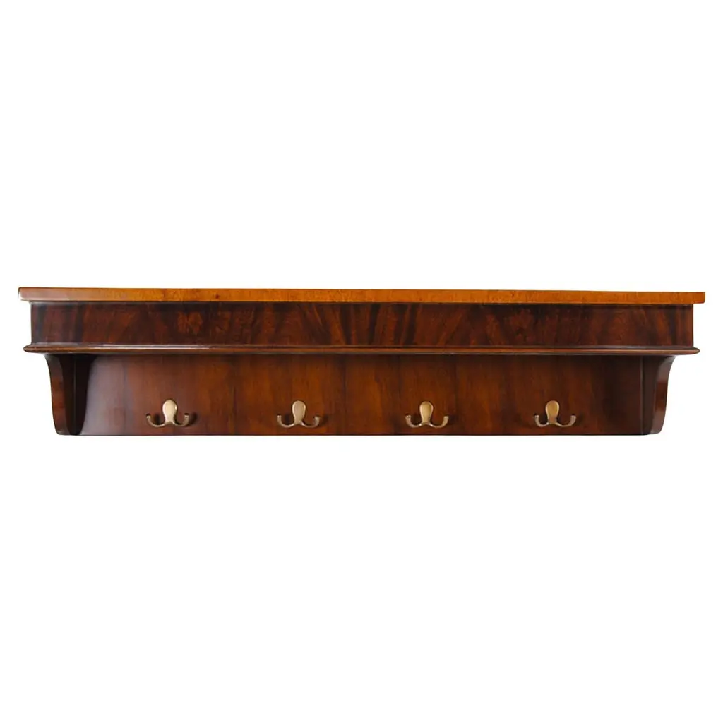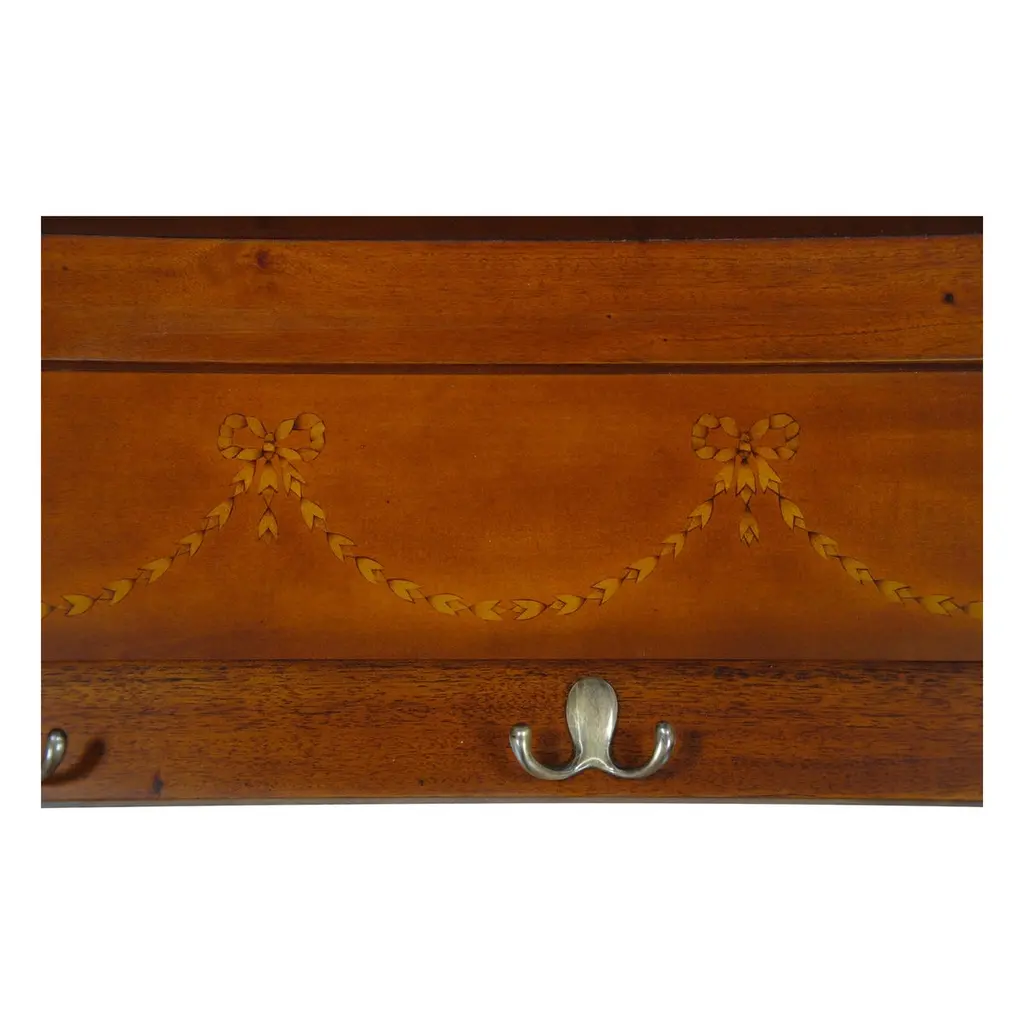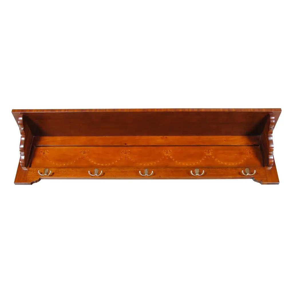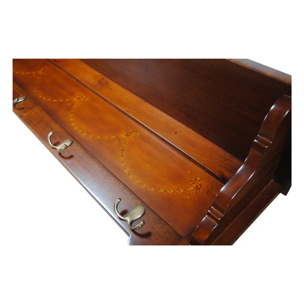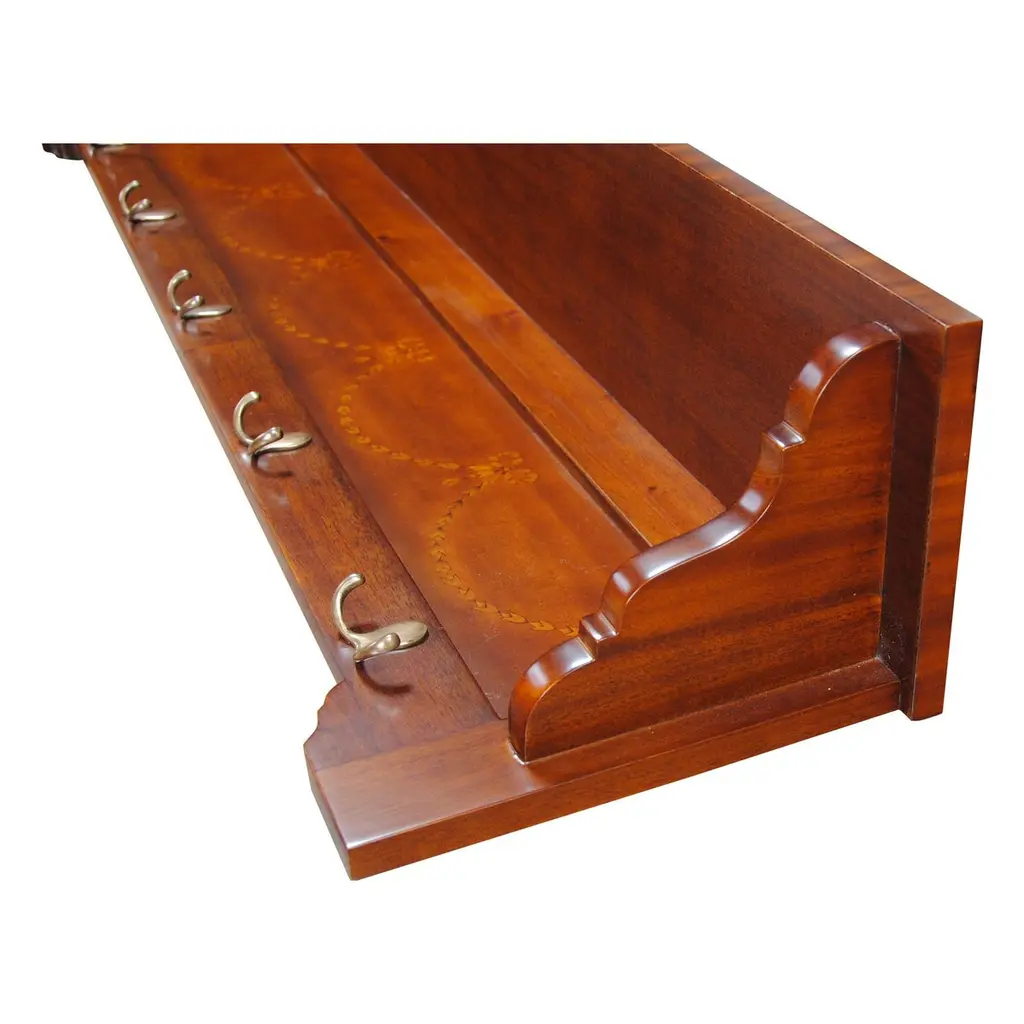 The Mahogany Coat Rack Shelf by Niagara Furniture is a great accessory that is both useful and decorative. Created from the finest mahogany solids and veneers the overall shape and style of the piece will fit in with almost any decor and add a little bit of elegance to any setting. Especially attractive are the hand cut inlays which form a floral motif in the center panel of the piece. Ideal for hanging coats in an entry way the Mahogany Coat Rack Shelf can also be utilized to hang such everyday items as car keys, backpacks, even kitchen utensils. The solid brass hangers are bolted through the back of the shelf to add strength and support. The flat top section of the shelf can be used to display and store items as well.The item ships complete with screws for mounting on a wall.Measures 48″w x 8″d x 11″h