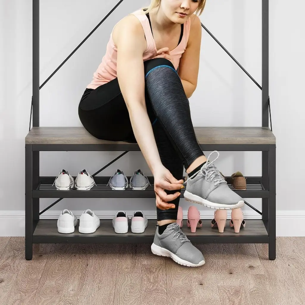 Streamline your entryway with the Nasitip 3-in-1 Hall Tree—an coat rack, shoe storage, and bench combination that offers both style and utility. Crafted from a sturdy iron frame and durable wood, this hall tree features 8 dual hooks, a spacious bench for sitting or placing bags, and two lower shelves for organized shoe storage. Its space-saving vertical design makes it ideal for narrow spaces, offering a practical solution for hallways, bedrooms, mudrooms, or living rooms. Whether you're heading out the door or returning home, this coat rack helps keep essentials neatly within reach.