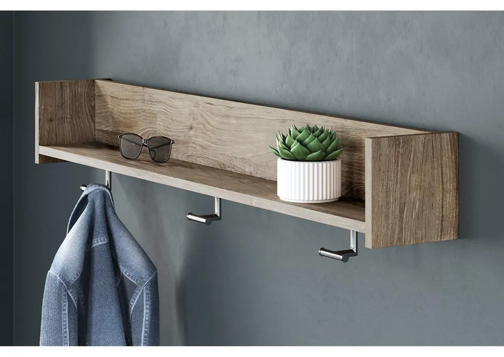 The stylish and versatile Oliah wall-mounted coat rack is an ideal addition to your entryway or mudroom. It features an open shelf for easy access or display. A dry, light finish with replicated oak grain is accented with three brushed nickel-tone hooks for hats and handbags. Wall mounting bracket included. Weight 19.000 lbs. (8.55kgs.)