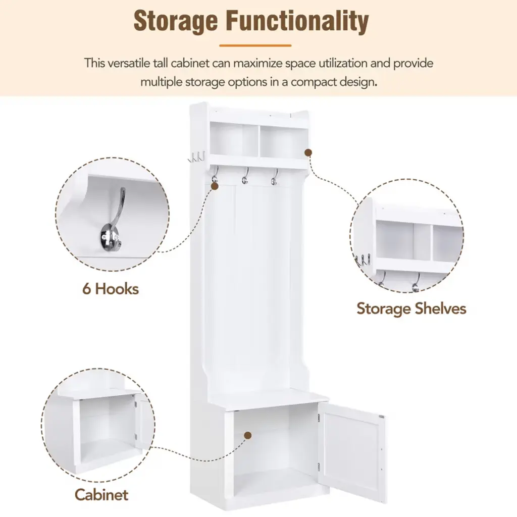 This sleek hall tree combines a storage bench, cabinet, and six hanging hooks for a stylish, space-saving solution. Perfect for hallways and living rooms, it keeps your space organized and elegant.