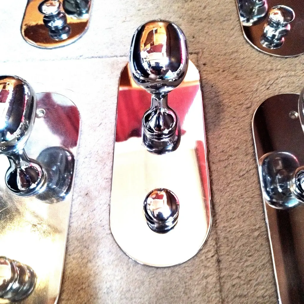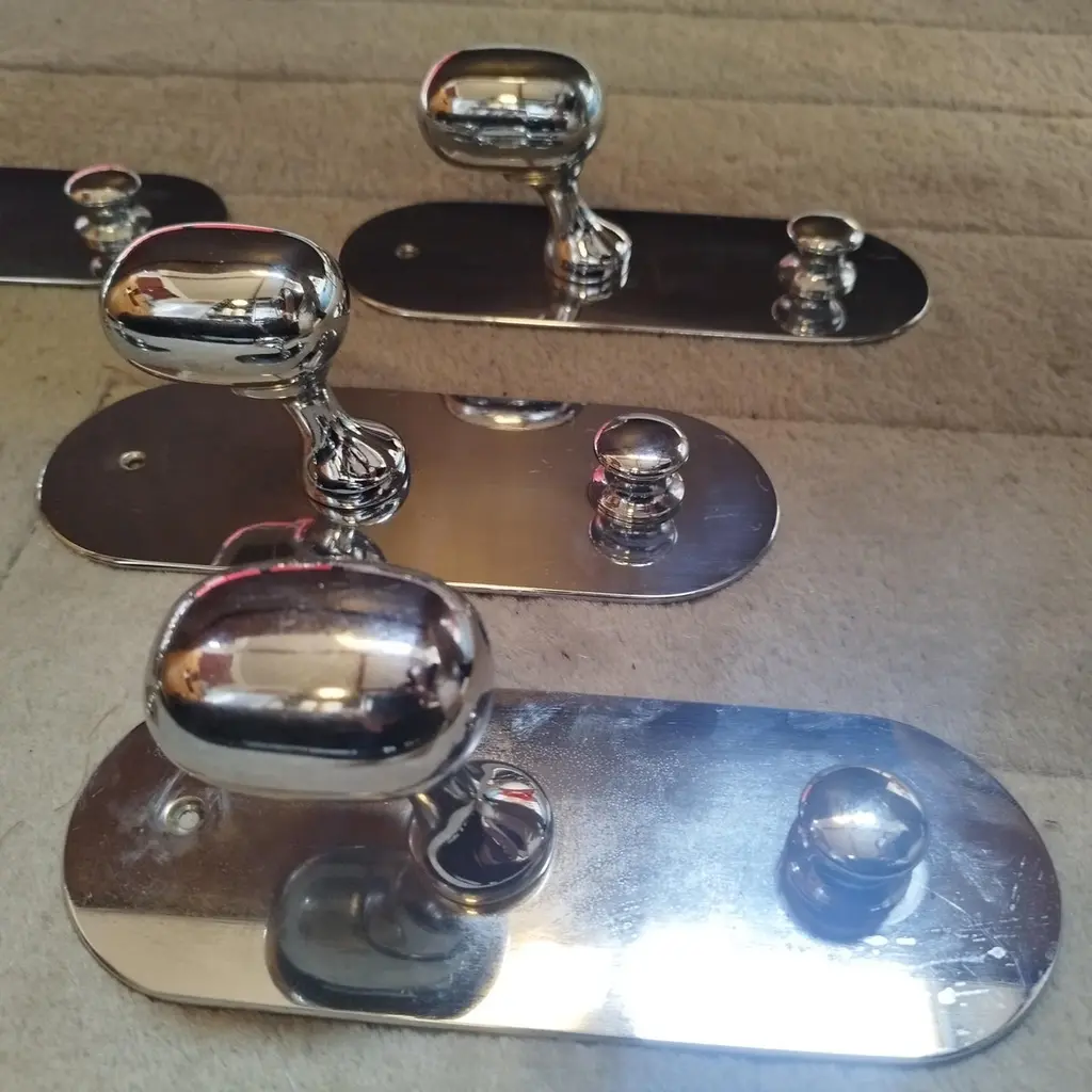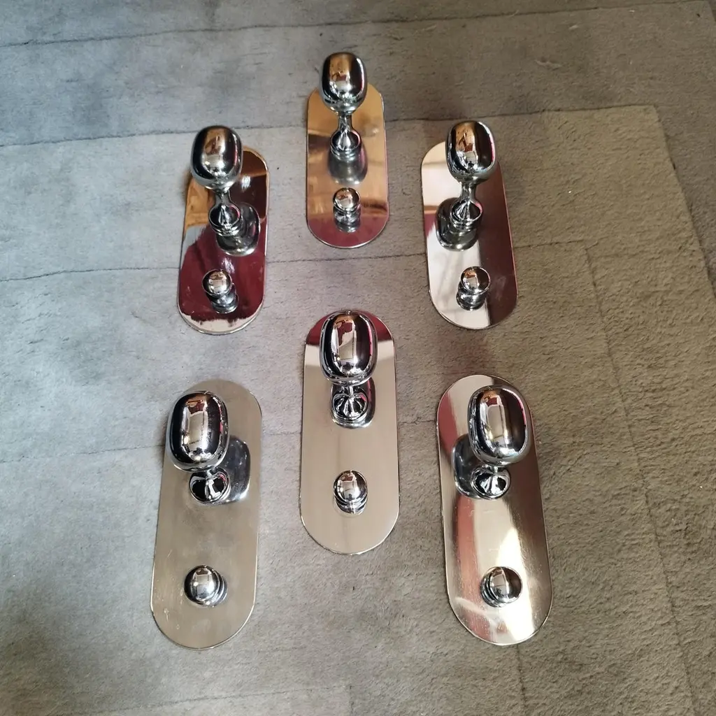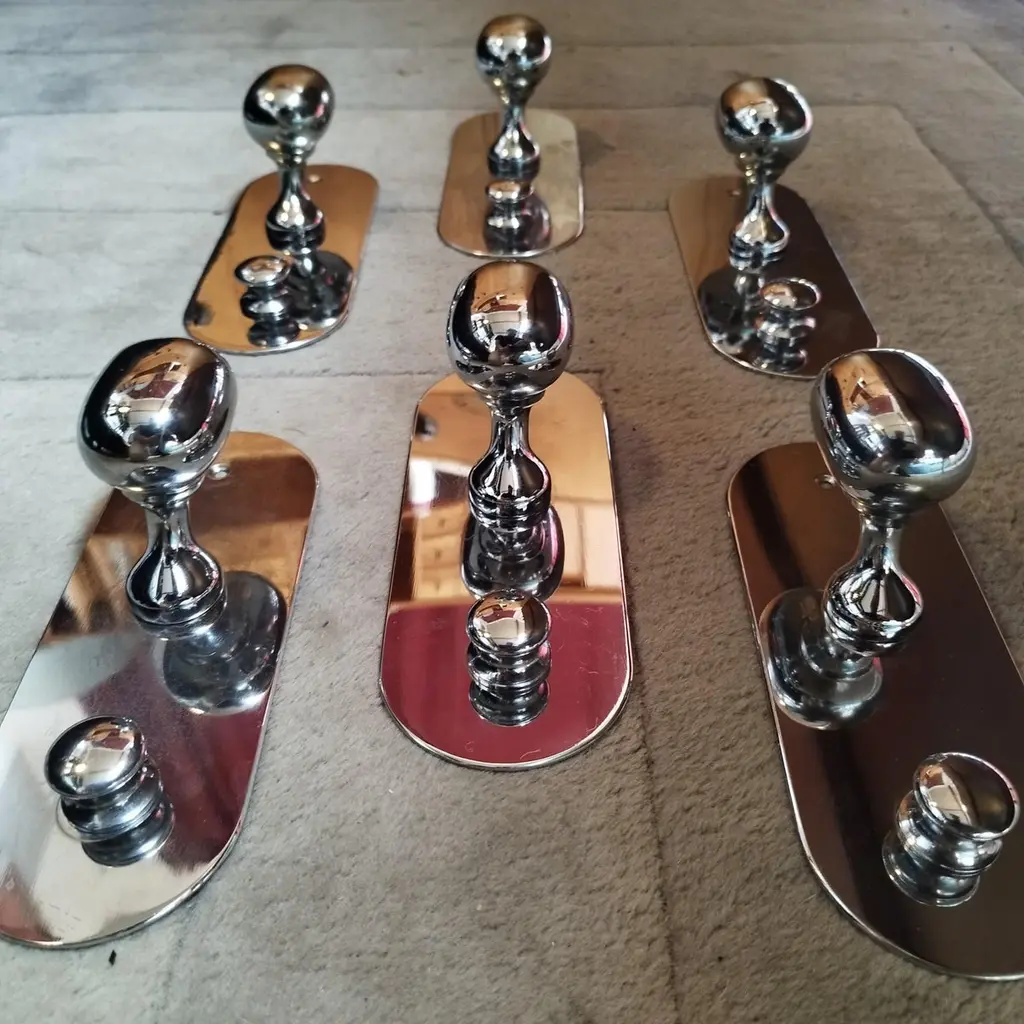 6 Patata ("potato") coat hangers by Luigi Caccia Dominioni for Azucena, in nickel-plated brass. Patata is one of Luigi Caccia Dominioni's most famous designs, featured both as handles and coat hangers. Luigi Caccia Dominioni was one of the most important architects of Milan's post-war renaissance. The buildings he designed shape the city's urban landscape. The furniture he designed initially started as specific project pieces and were later produced in series by Azucena, a company he founded together with Ignazio Gardella.