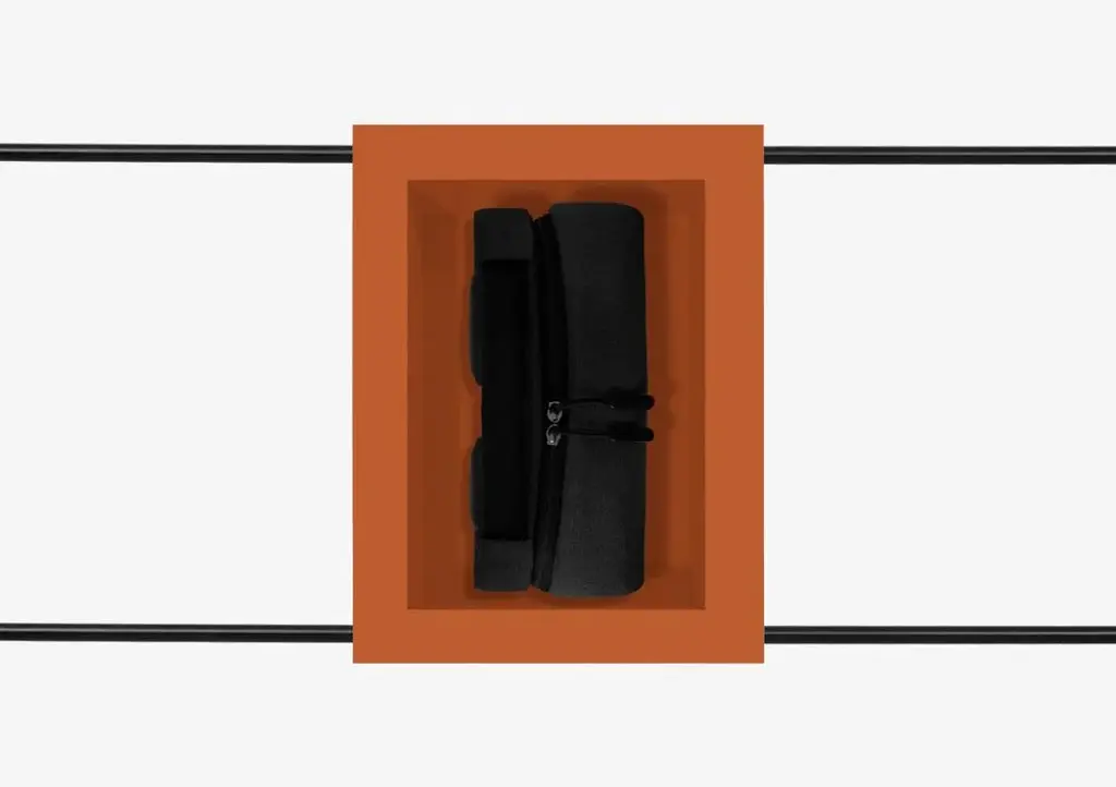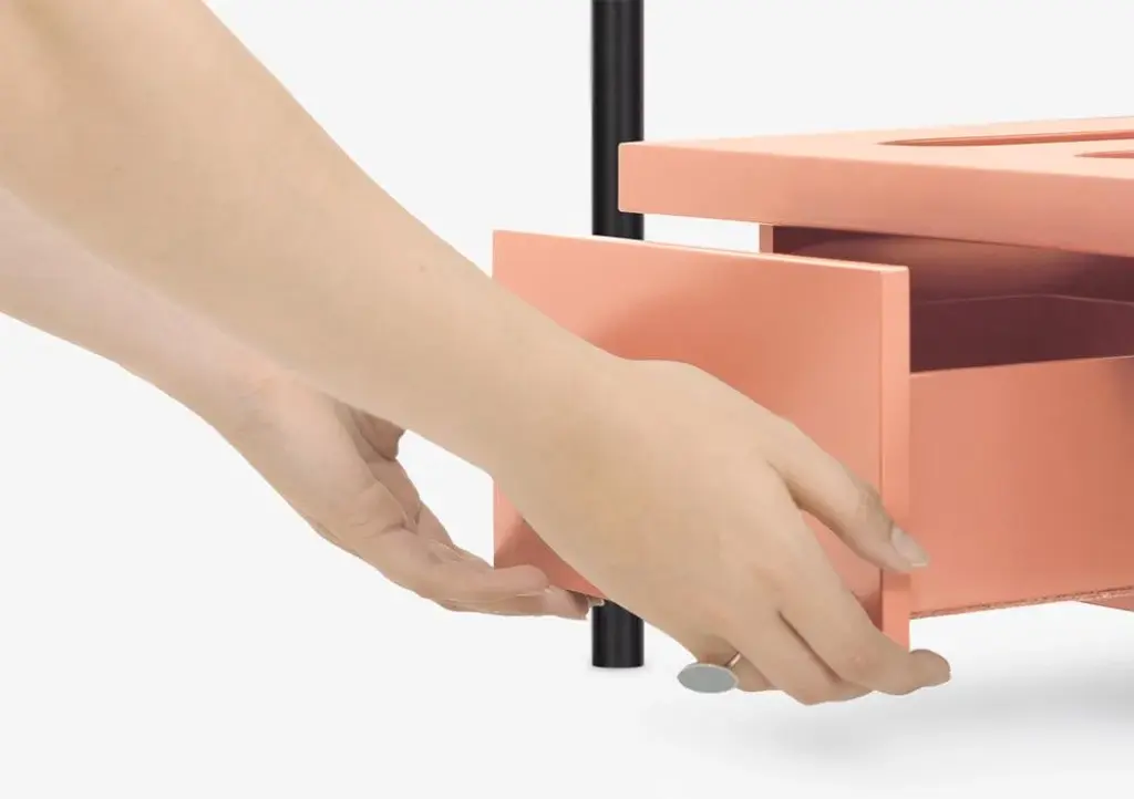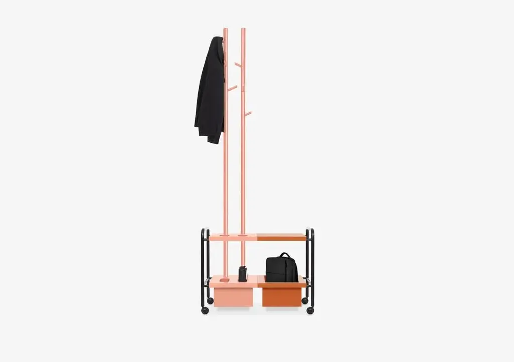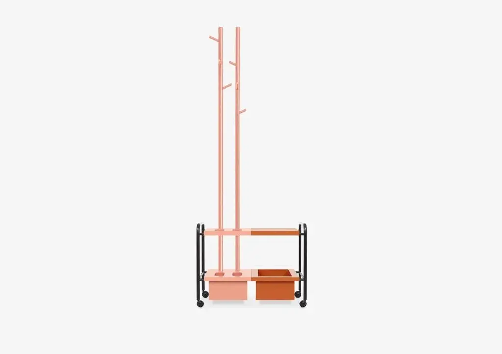 Coat stand composed of 1 lacquered steel structure with wheels and 3 tops in lacquered mdf. The living tops have a recess that allows a simple fit into the structure and you can easily change the order of placement. This set includes: 1 side table / coat stand structure with wheels - lacquered steel - black 1 coat stand - lacquered - dark blue - includes 2 coat hangers in the same finish of the tops and drawer with 1 water drip vase 1 small box - lacquered - brick 1 box - lacquered - brick