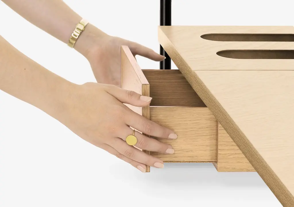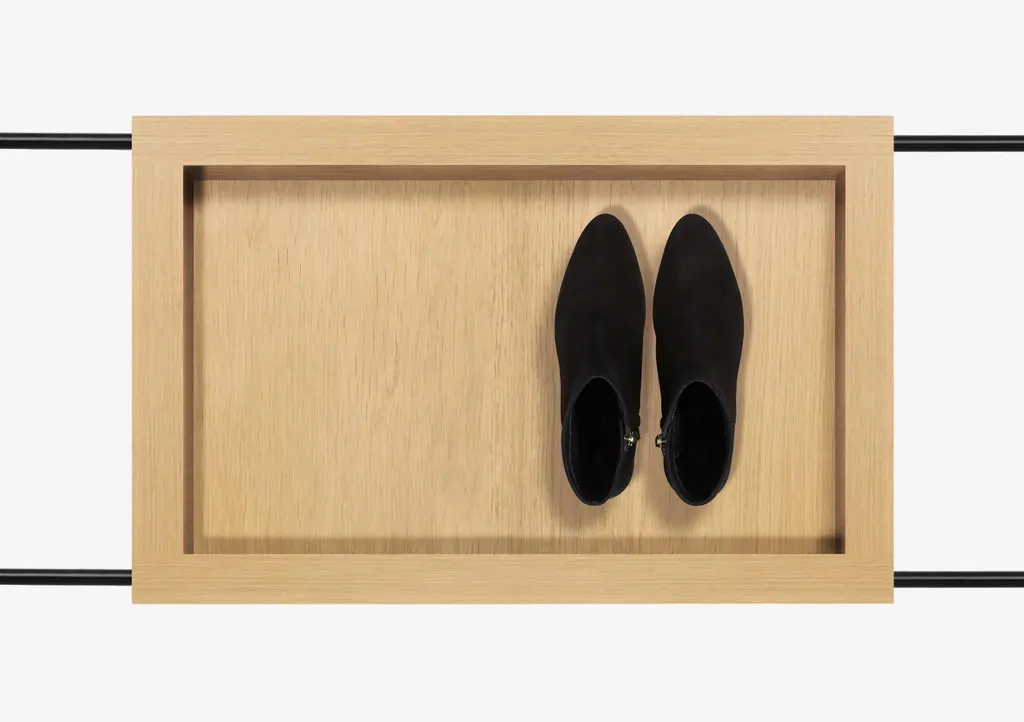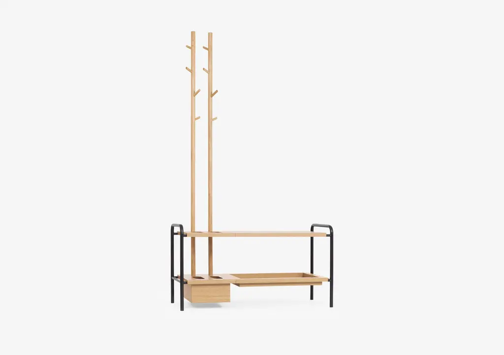 Coat stand composed of 1 lacquered steel structure with fixed feet and 3 tops in solid oak wood and MDF veneered with natural oak leaf. The Living tops have a recess that allows a simple fit into the structure and you can easily change the order of placement. This set includes: 1 Side table / coat stand structure with fixed feet - Lacquered steel - Black 1 Coat stand - Oak - Natural - Includes 2 coat hangers in the same finish of the tops and drawer with 1 water drip vase 1 Large top - Oak - Natural 1 Large tray - Oak - Natural