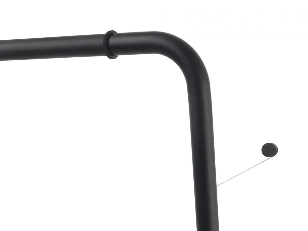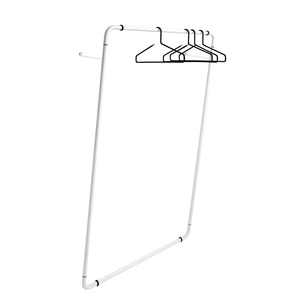 Hangers not included.Wall-mounted coat rack (pull-down)Made of steel with fine powder-coated finish, 2 wire fixings on wall including magnet for fixing to wall.Striking in its reserve. The curve coat rack combines impressive functionality with smart understatement. The powder-coated metal frame is attached to the wall by a wire. When not in use, it can be positioned upright against the wall and secured by a magnet, leaving the wire to retract. The minimalist solution is available in two widths. Ideal for offices, it is equally at home in the house, for hanging coats in hallways or clothes in bedrooms and dressing rooms. Space-saving and sophisticated.