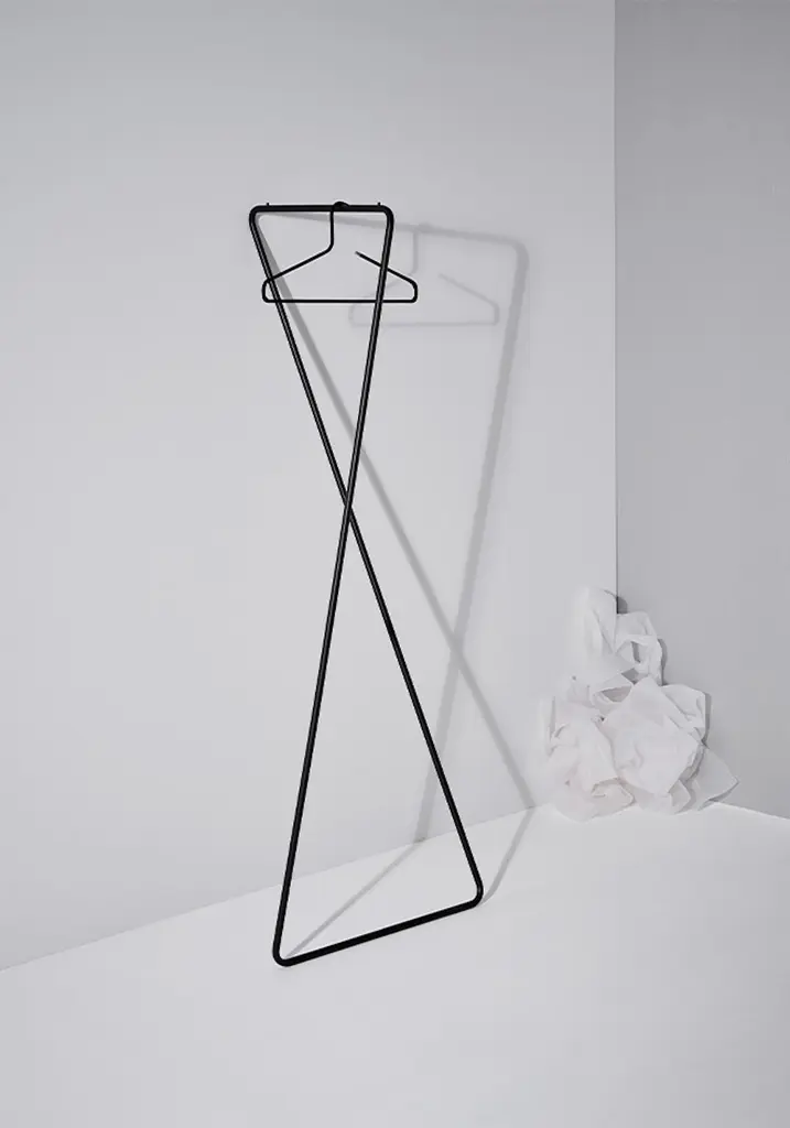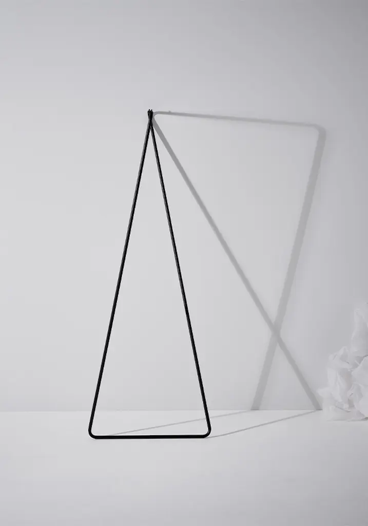Steel, powder-coated, fine structure, .198 blackmade of 2 parts, includes wall fixingholds up to 15 kg when evenly distributedA coat stand with a twist: LINNEA by Yuno Design changes shape, depending on the angle you view it from. It plays with optical illusions: from the front it looks like an acute triangle, from the side its contours suggest more of a flowing hour-glass shape.“Impossible geometric figures like the Möbius strip, Necker cube and Penrose triangle were something we found really fascinating, even back then, as students,” Lena Billmeier and David Baur of Studio Yuno agree. “LINNEA reminds us of them. They are difficult to grasp but visually enchanting.”The minimalist coat stand LINNEA lives from its powerful shape and offers hanging space for clothing even in the tightest of spaces. It seems to lean casually against the wall but also be attached to it with tilt protection. LINNEA is made of powder-coated steel tubing and comes in Schönbuch black. It is 1.62m high.