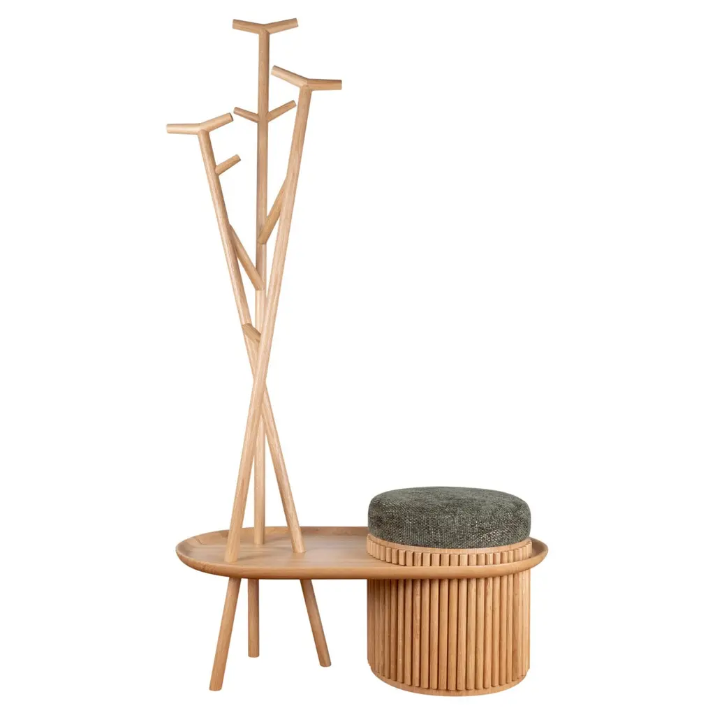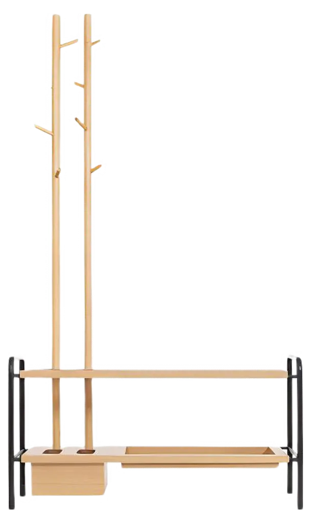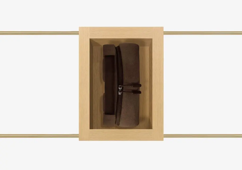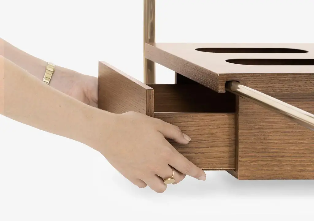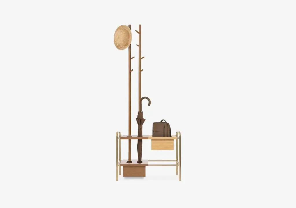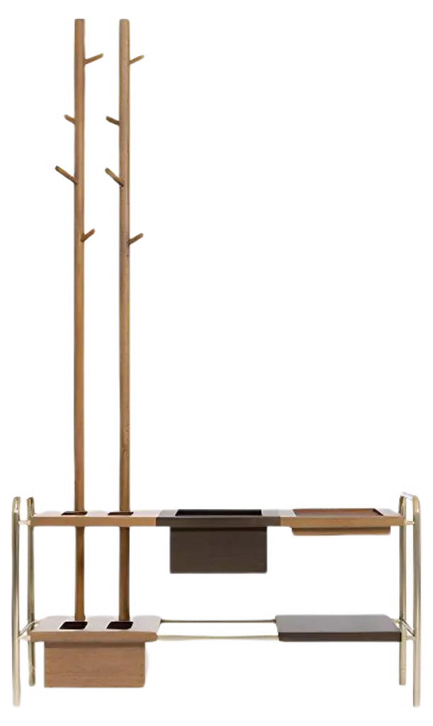 Coat stand composed of 1 polished stainless steel structure with fixed feet and 2 tops in solid oak wood and MDF veneered with natural oak leaf. The Living tops have a recess that allows a simple fit into the structure and you can easily change the order of placement. This set includes: 1 Side table/ coat stand structure with feet – Polished stainless steel – Gold 1 Coat stand – Oak – Brown – Includes 2 coat hangers in the same finish of the tops and drawer with 1 water drip vase 1 Box – Oak – Natural