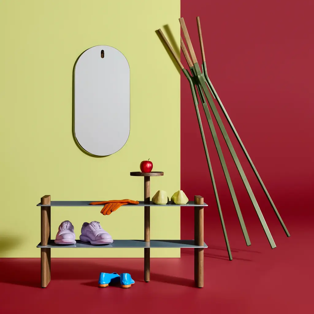 Powder-coated steel and solid walnut or white oak stand at the ready to relieve you of jackets, hats, scarves and bags in style. Dress it up or keep it naked. Either way it remains easy on the eyes. Who says utility can’t be attractive?