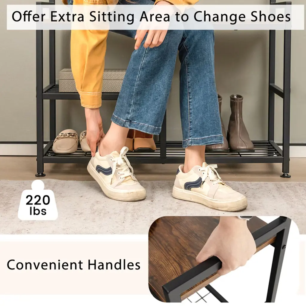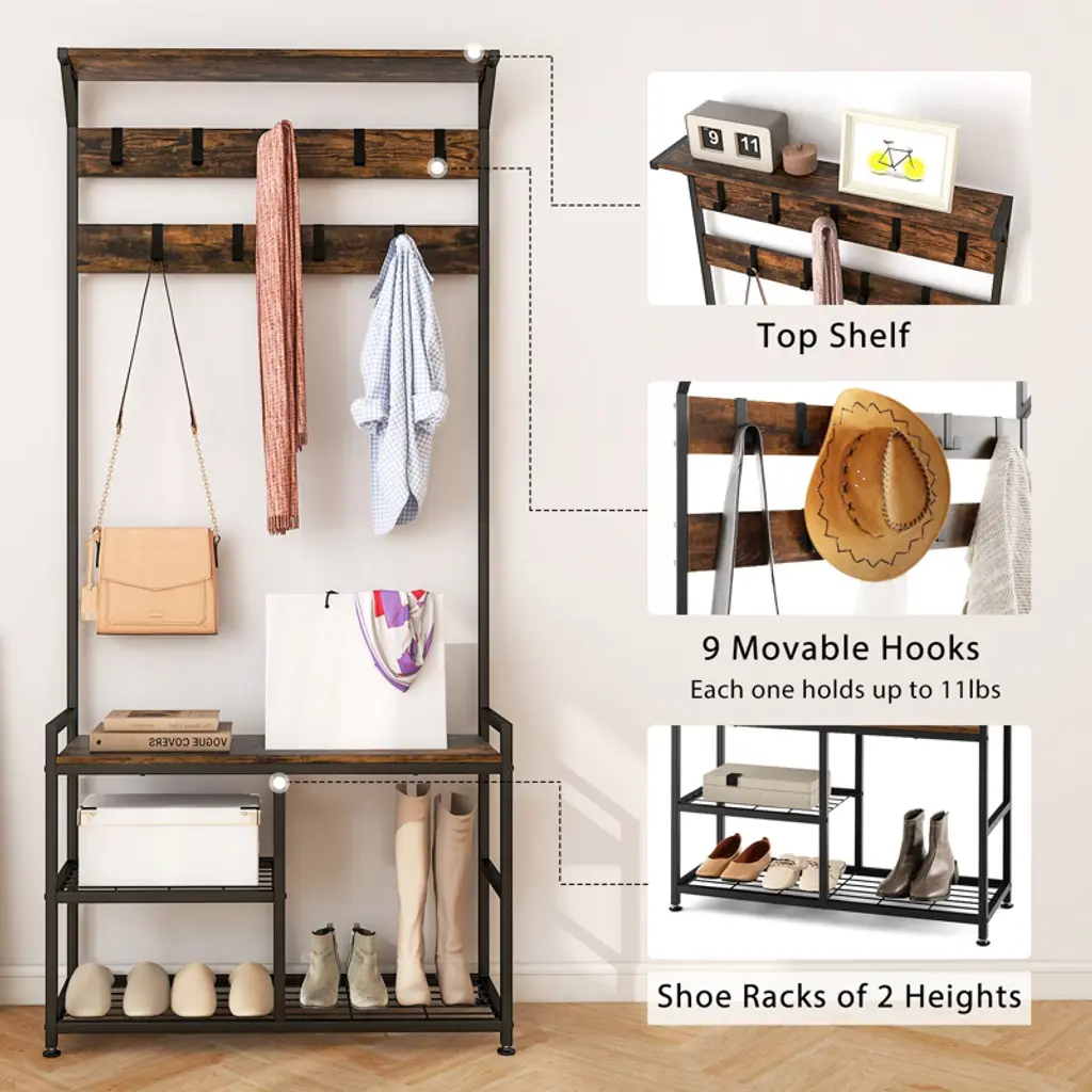 This entryway coat rack is a perfect combination of aesthetics and practicality. Made of high-quality metal and board, this entryway coat rack is long-lasting and provides a sturdy stool for you to sit and change shoes. In addition, the top shelf, 9 movable hooks and 2-tier shoe rack can hold a variety of decorations, clothes, shoes and more to keep your room clean and tidy. You can put this industrial 3-in-1 clothes rack at entry, bedroom and other places to complement your space.FeaturesBench to offer extra sitting area to change shoesShoe rack of 2 heights to hold various shoes9 Movable hooks to hang bags and clothes anywhereAnti-tipping device to prevent tipping over or wobblingApplicable to entryway, foyer, bedroom and moreRustic brown board and metal frame for a vintage lookEasy-to-follow manual ensures convenient assemblySpecifications: Color: Rustic Brown + Black Material: Engineered Wood, Metal Product Dimensions: 33" x 12" x 72" (W x D x H) Net Weight: 29 lbs Weight Capacity of Shoe Bench: 220 lbs Package Includes: 1 x Coat Rack 9 x Movable Hooks 1 x User’s Manual