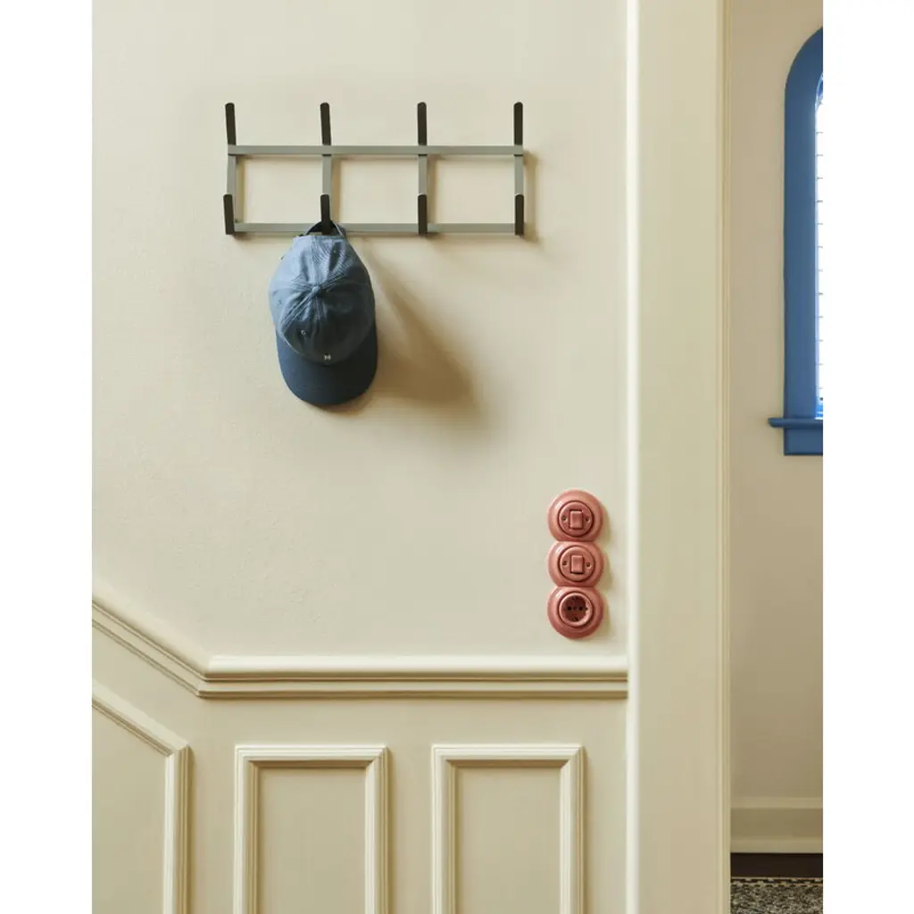 HAY's Tape coat rack stylishly and efficiently adds extra storage space to even the smallest entryways. Designed by the BIG-GAME, the wall-mounted rack features a charming industrial construction made of steel. The steel rods are complemented by hooks that provide a neat place to hang coats, hats, umbrellas as well as scarves. The Tape coat rack enhances the look of entryways, hallways and dressing rooms, whether used individually or in series.