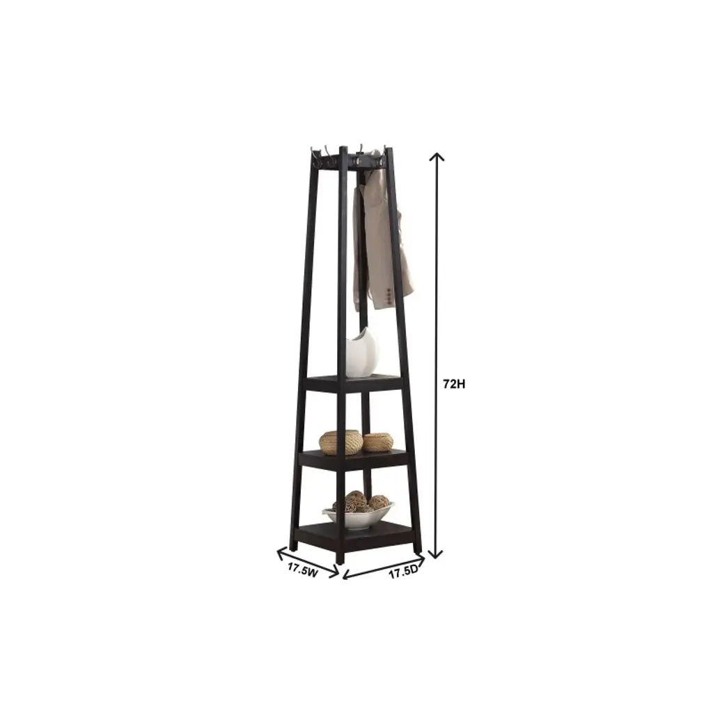 White Finished Wood Coat Rack with 3-tier Storage Shelves.Dimension: 17.5'' x 17.5'' x 72''H.Big hooks in a striking silver finish for coats, scarves and jackets.Three storage shelves is perfect for adding extra storage.