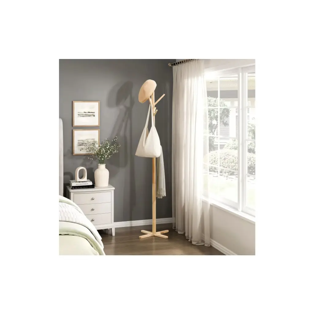 Description & Dimensions Organize your entryway or mudroom with modern style and exceptional functionality with this sleek coat rack. Crafted from solid wood and finished in a beautiful natural tone, this piece offers robust stability and a contemporary aesthetic that complements various modern and Scandinavian-inspired decors. Its clever 3-tier design features a total of 9 hanging hooks, providing ample space for coats, hats, scarves, and bags, helping to keep your home tidy and welcoming. While assembly is required, its durable construction and generous storage capacity make it an ideal and practical addition to any busy household, offering a convenient solution for all your outerwear needs. PRODUCT DIMENSIONS: Overall Dimension: 17.5" x 17.5" x 70"H Listing Includes: - 1pc Coak Rack Only. Simple Assembly Require