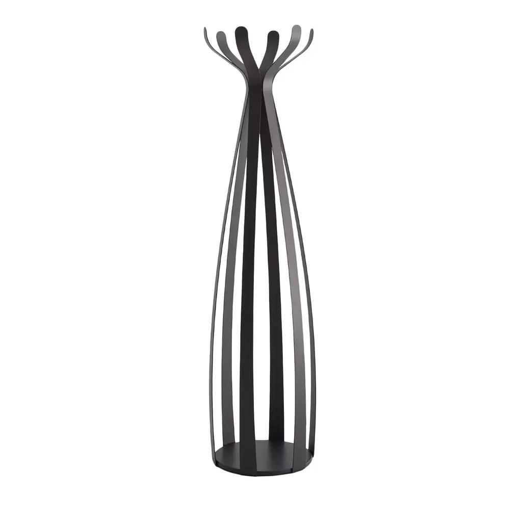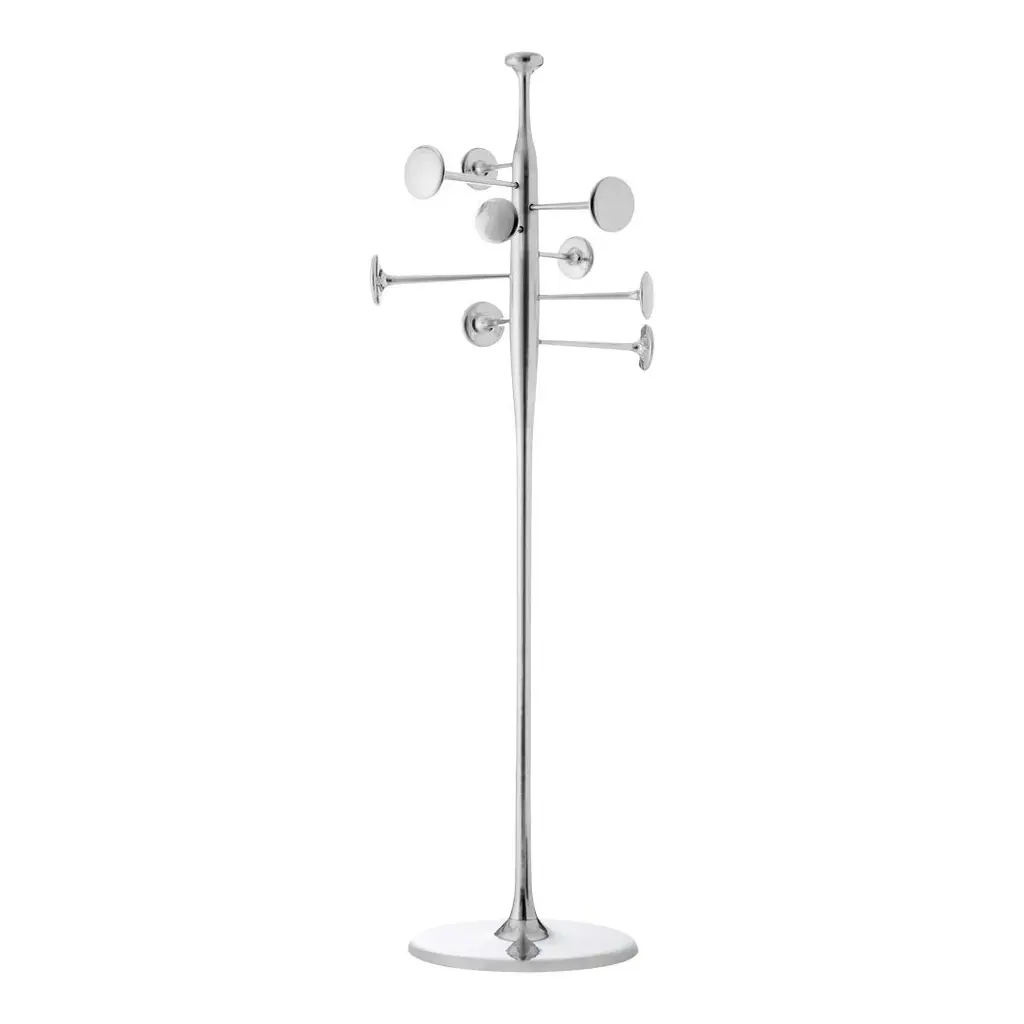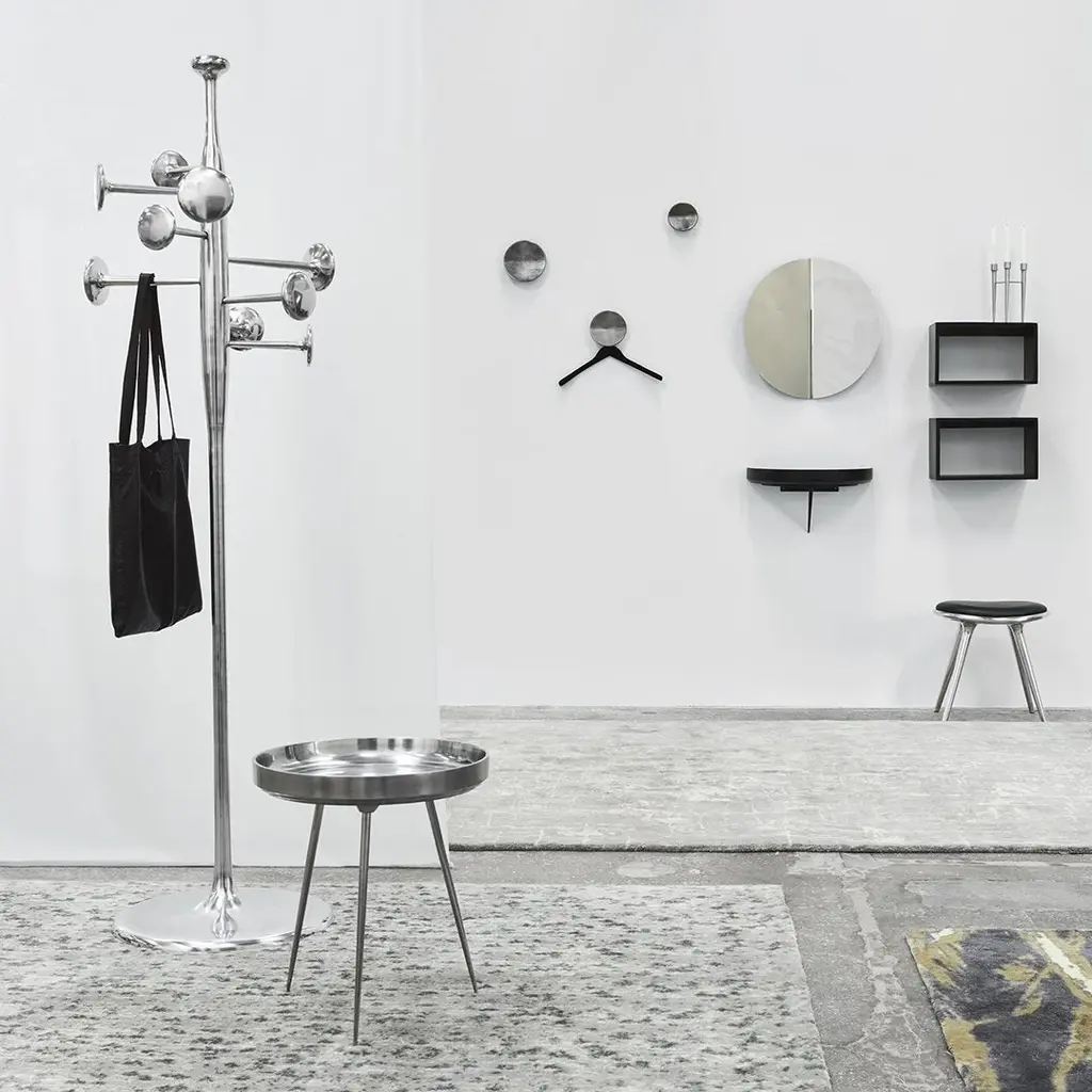 Mater Trumpet Coat Stand is a contemporary and sculptural piece of design made by the Danish architect duo Space Copenhagen. The nine discs in three different sizes are fitted to the stand and positioned at angles suitable for hanging hats, scarves and umbrellas. Trumpet is crafted by the ancient technique of sand casting in a small workshop in Northern India. The raw material is derived from 70 % aluminium waste. Trumpet is flat-packed for ease of labour and transportation.