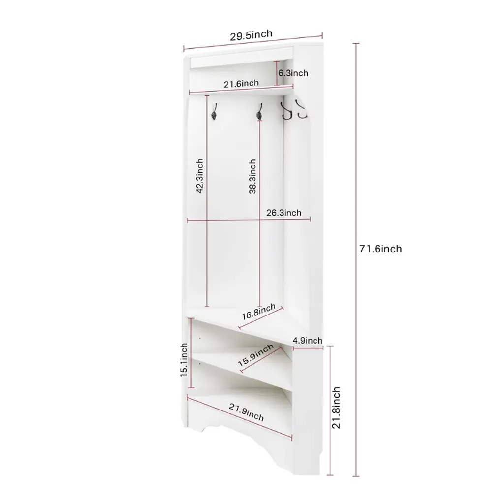 Space-Saving Corner Hall Tree: Perfect for small spaces, this corner hall tree with shoe bench efficiently utilizes corner space, offering a stylish and functional storage solution for entryways and hallways. Multifunctional Storage Features: Includes an adjustable shoe shelf, four coat hooks, and top storage, allowing you to organize shoes, coats, and accessories in a compact yet efficient way. Sleek and Minimalist Design: With its modern, minimalist design, this hall tree blends seamlessly into any home decor. Its clean lines and neutral colors make it a versatile addition to your home. Traditional Skirting for Stability: The traditional skirting design enhances the cabinet’s aesthetic and ensures better stability, allowing it to sit securely against the wall. Durable MDF Construction: Constructed from premium MDF, this hall tree is sturdy, easy to clean, and built to last. Its quality construction ensures long-term reliability.