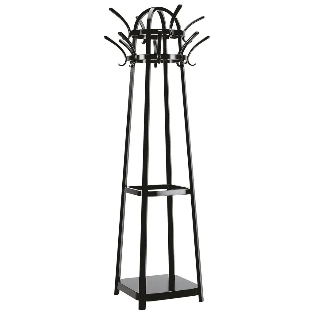 Black Finished Wood Coat Rack with 3-tier Storage Shelves.Dimension: 17.5'' x 17.5'' x 72''H.Big hooks in a striking silver finish for coats, scarves and jackets.Three storage shelves is perfect for adding extra storage.Photo may be slightly different from the actual item in terms of color due to the monitor's display.