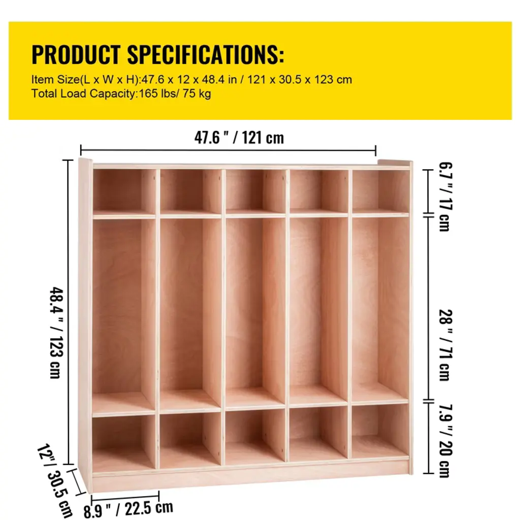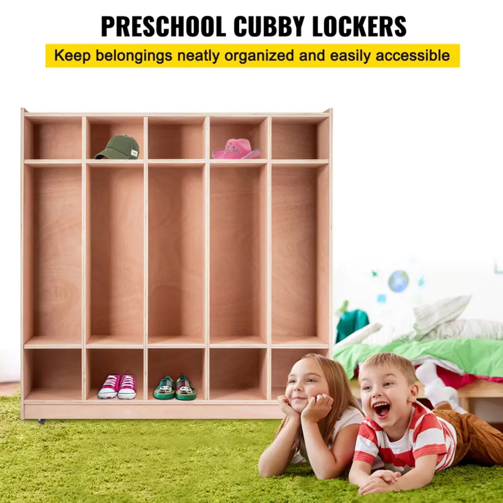 Feature: Organized Storage: Start with our 5-section coat locker for a tidy and organized space. Give toys, books, and other items a designated place, making it easy to tidy up and keep life organized. Easy to Use: Make every child's growth journey easier and more enjoyable with our daycare cubby coat rack. Designed at the perfect height for kids, they can easily access and put away items, fostering independence and making growing up fun. Safe and Considerate: VEVOR classroom coat locker are designed with safety and durability. With rounded edges, our cubes ensure children are safe during use, giving parents peace of mind. High Quality Material: Crafted from durable particleboard and poplar wood, this daycare cubbies with hooks offers reliable strength and stability, enduring the daily wear and tear of children's activities, and accompanying them through their growth. Develop Good Habits: With a simple design, our cubby lockers for kids not only enhances children's spatial awareness but also encourages kids to participate joyfully in organizing their belongings, fostering self-reliance and cultivating good habits. Package Content 1 x Coat Locker 4 x Wheels 1 x Flat Wrench 2 x Anti-theft Device 1 x Instruction Manual