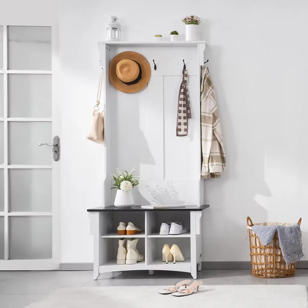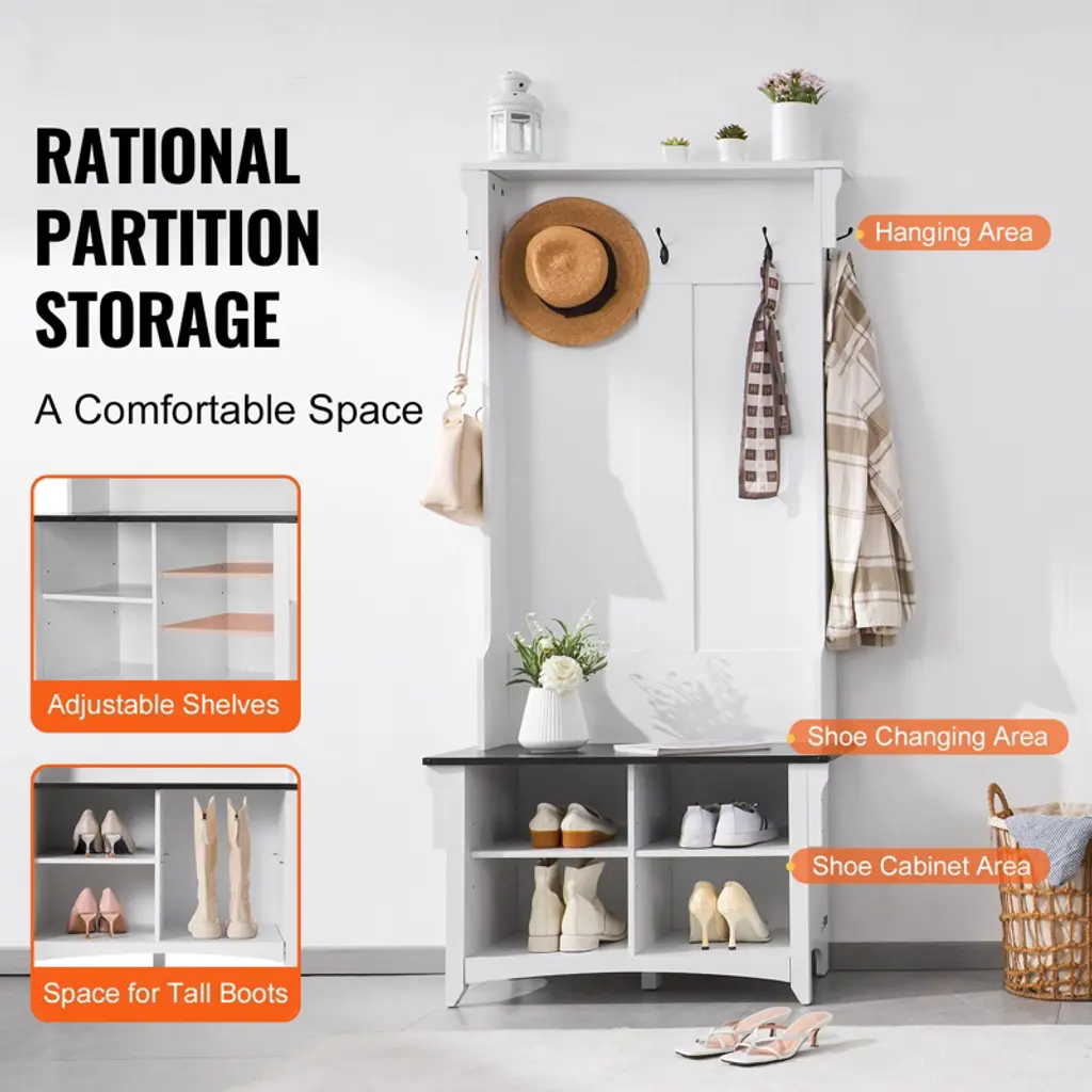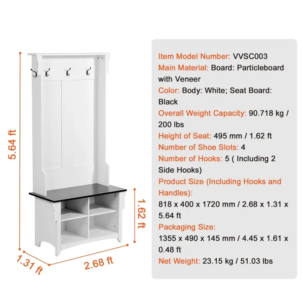 Feature: Smart Storage: This hall tree helps you organize effortlessly with its all-in-one design, which saves space. The shoe bench's adjustable and removable sides make it easy to store tall boots without hassle. Spacious and Roomy: With 4 shoe compartments and 5 hooks, this entryway tree organizes shoes, bags, and coats. The deep, wide slots fit all types of footwear, so your essentials are always within reach. Stylish and Practical: Coat rack with shoe storage matches various home styles, whether vintage or modern and adds a decorative touch to your space. Sturdy and Durable: Our hall tree with bench is built with high-density wood panels and durable metal, ensuring stability. Each hook holds up to 6.6 lbs, and the bench supports 200 lbs. Ventilated mesh keeps things fresh and deters pets, while rust-proof rails promise long-lasting use. Easy to Assemble: This mudroom bench is simple to put together, even for beginners. Clear instructions and included parts make setup quick and stress-free. Package Content 1 x Hall Tree 5 x Hooks 1 x Accessory Set 1 x User Manual 22 x Hole Stickers