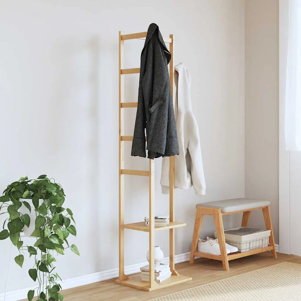 This minimalist bamboo coat stand is a classy way to organize your outerwear and accessories while adding a touch of style to your hallway or entrance. With its tall and slim build, it blends right into your space without taking up too much room, making it perfect for smaller homes or apartments. Whether you've got a bunch of coats to hang or need a stylish way to store your stuff, this coat stand provides the functionality and convenience you need. Two Spacious Shelves: The coat stand includes two strong shelves made from bamboo, giving plenty of room for hats, bags, or decorative items that add charm to your entryway.Single Hook Feature: A single hook extends from the stand, perfect for hanging scarves, hats, or umbrellas, keeping your must-haves within reach as you head out.Durable Construction: Made from high-quality bamboo fiber, this coat stand not only looks great but also offers solid support that stands up to daily use.Visual Appeal: The varnished finish highlights the natural texture of the bamboo, giving an eye-catching look that elevates the decor in any room.Eco-Friendly Material: Bamboo is known for being sustainable and water-resistant, making this coat stand a smart choice for those mindful of the environment.