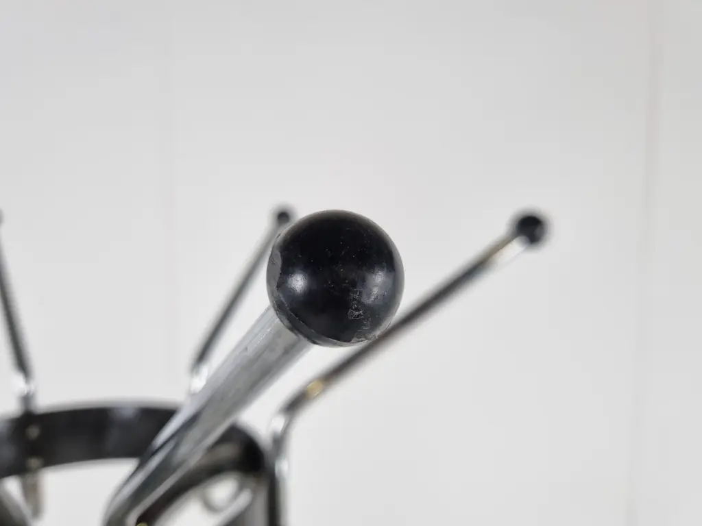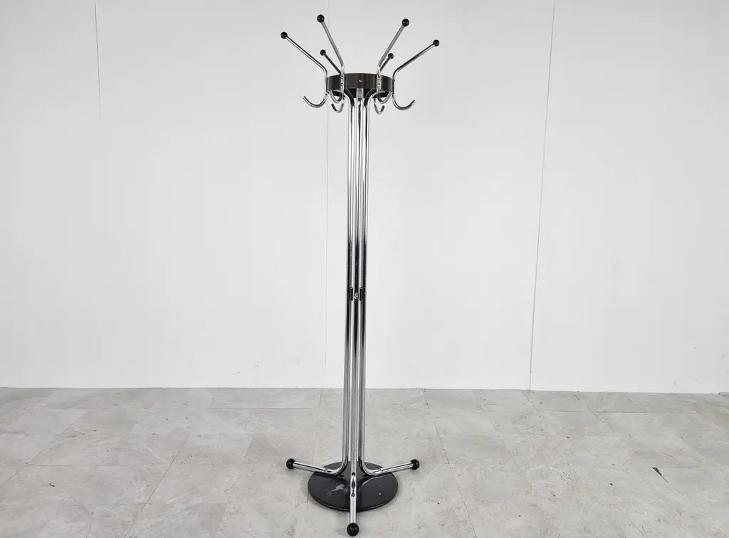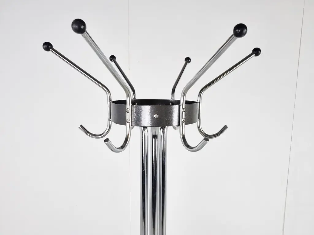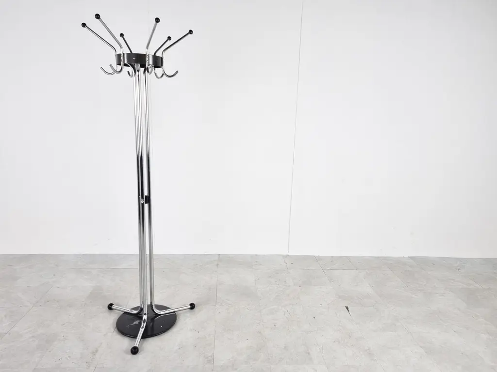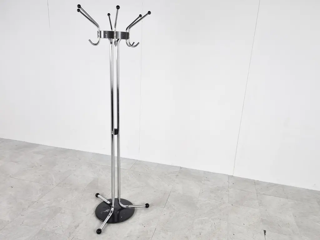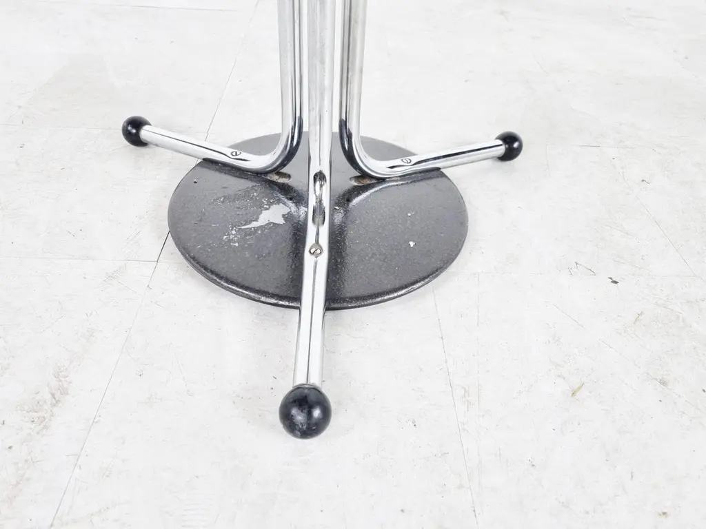 Vintage chromed steel coat stand designed by Willy Van Der Meeren for Tubax. - Model 022These where widely used in offices and for the Belgian army. 1970s - BelgiumGood condition with age related wear.Dimensions:Height: 185cm/72.83"Diameter: 60cm/23.62"Price is per item.