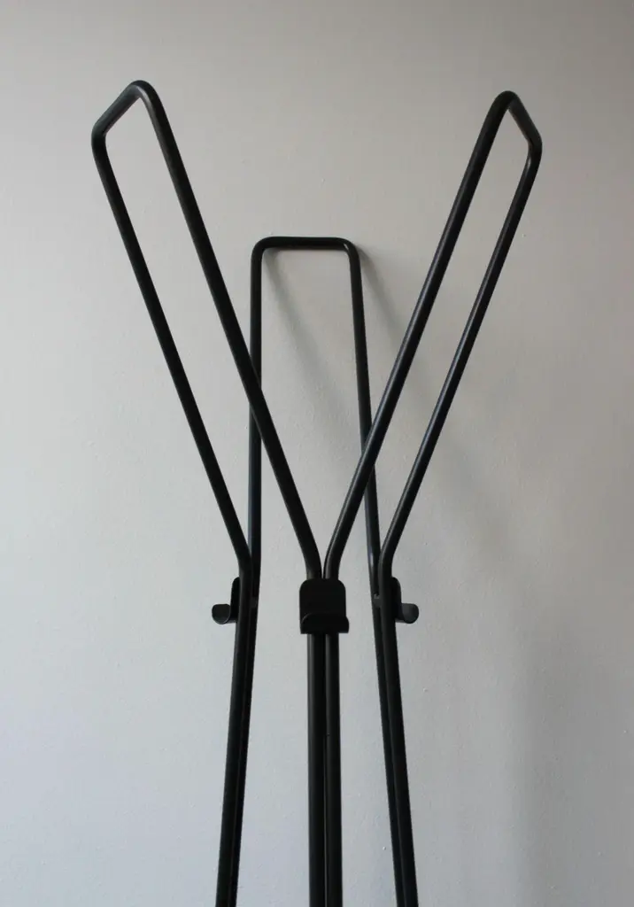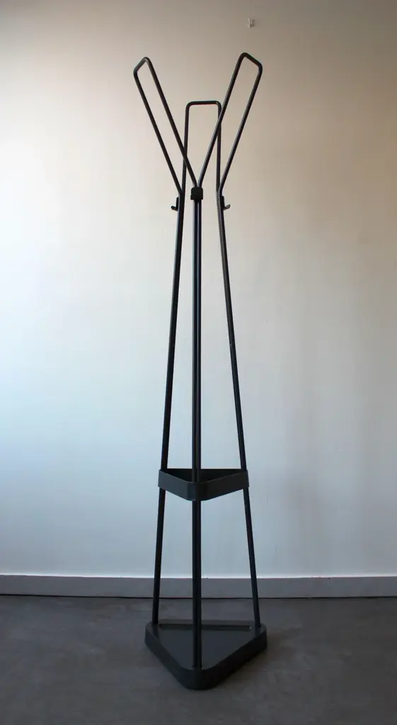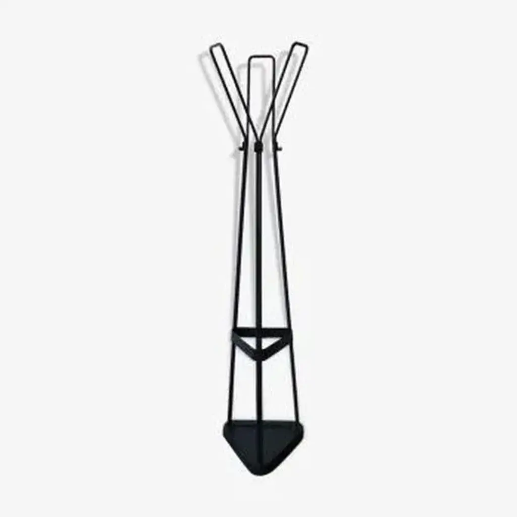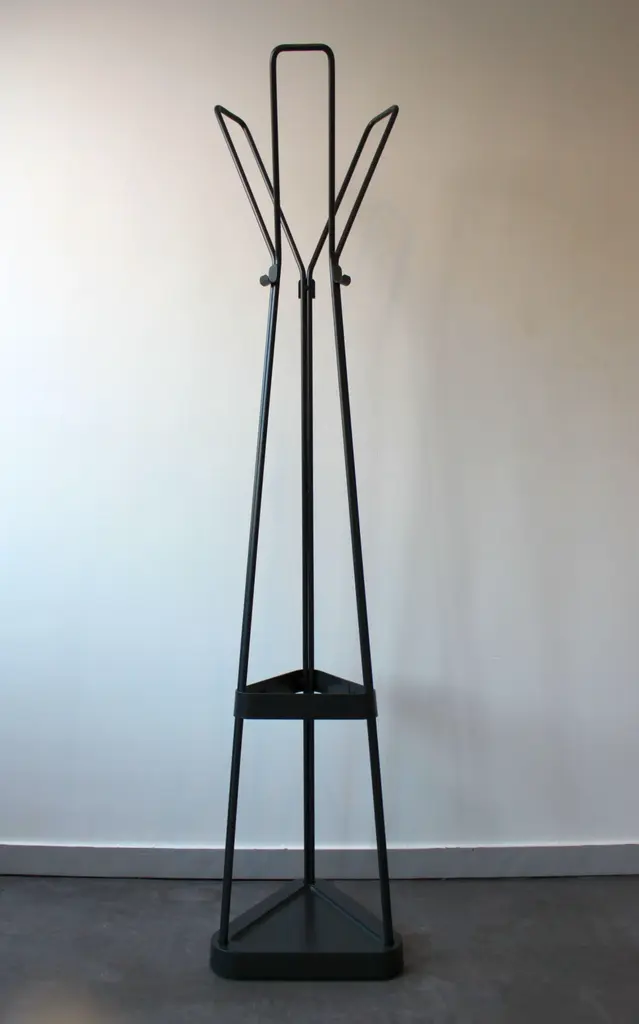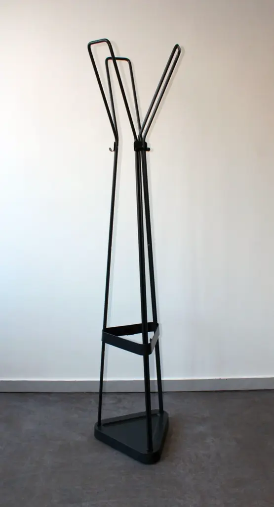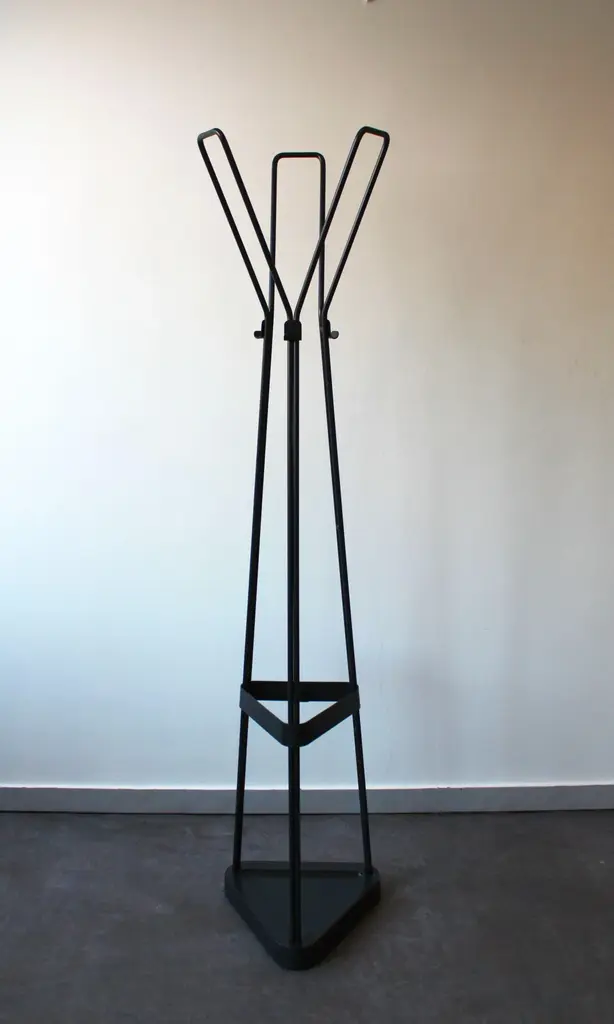 Metal coat rack consisting of 3 coat hooks, 6 hooks and umbrella holder. Triangular base. Solid and robust, combining design and practicality.