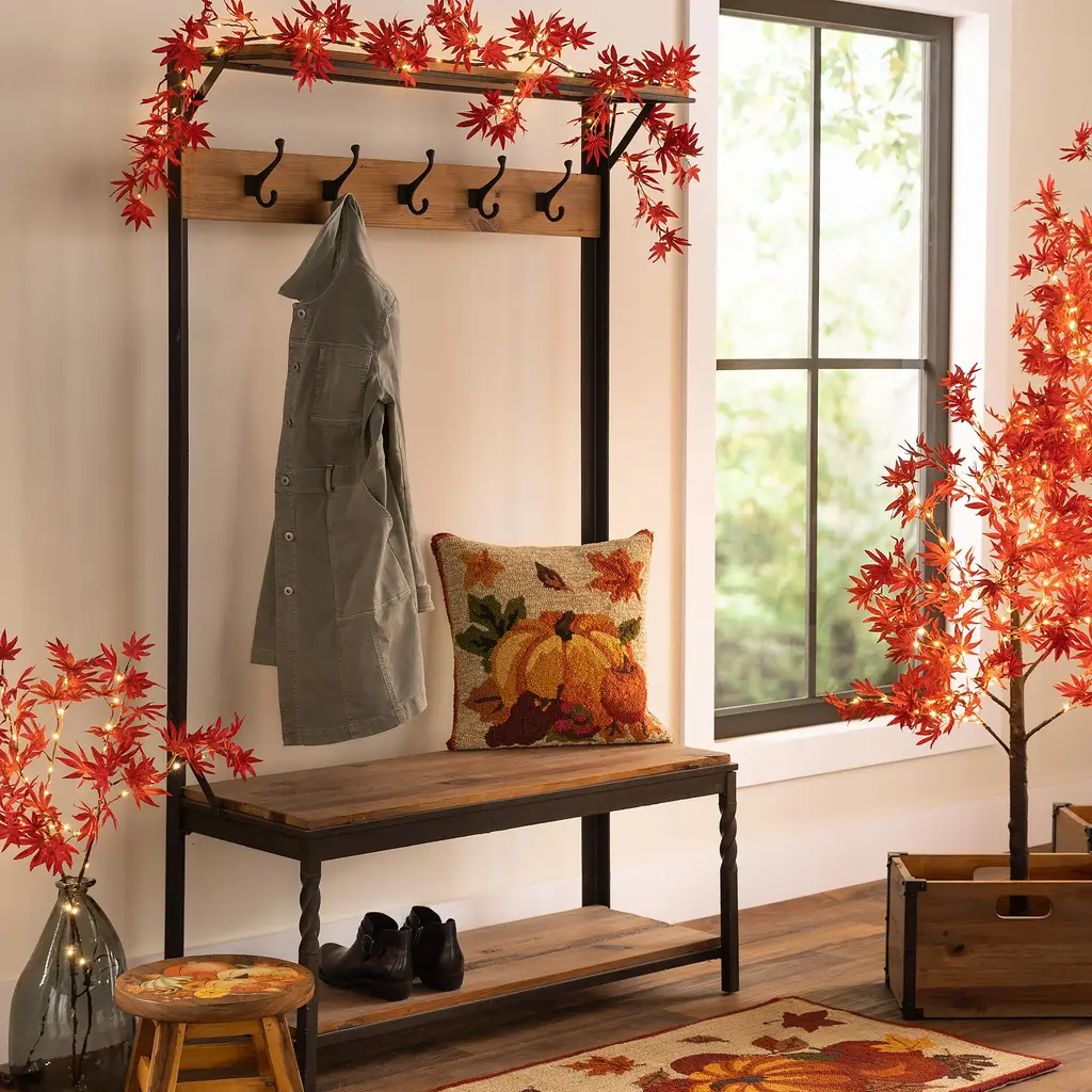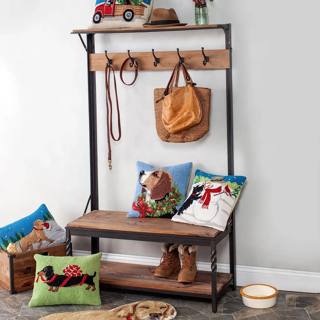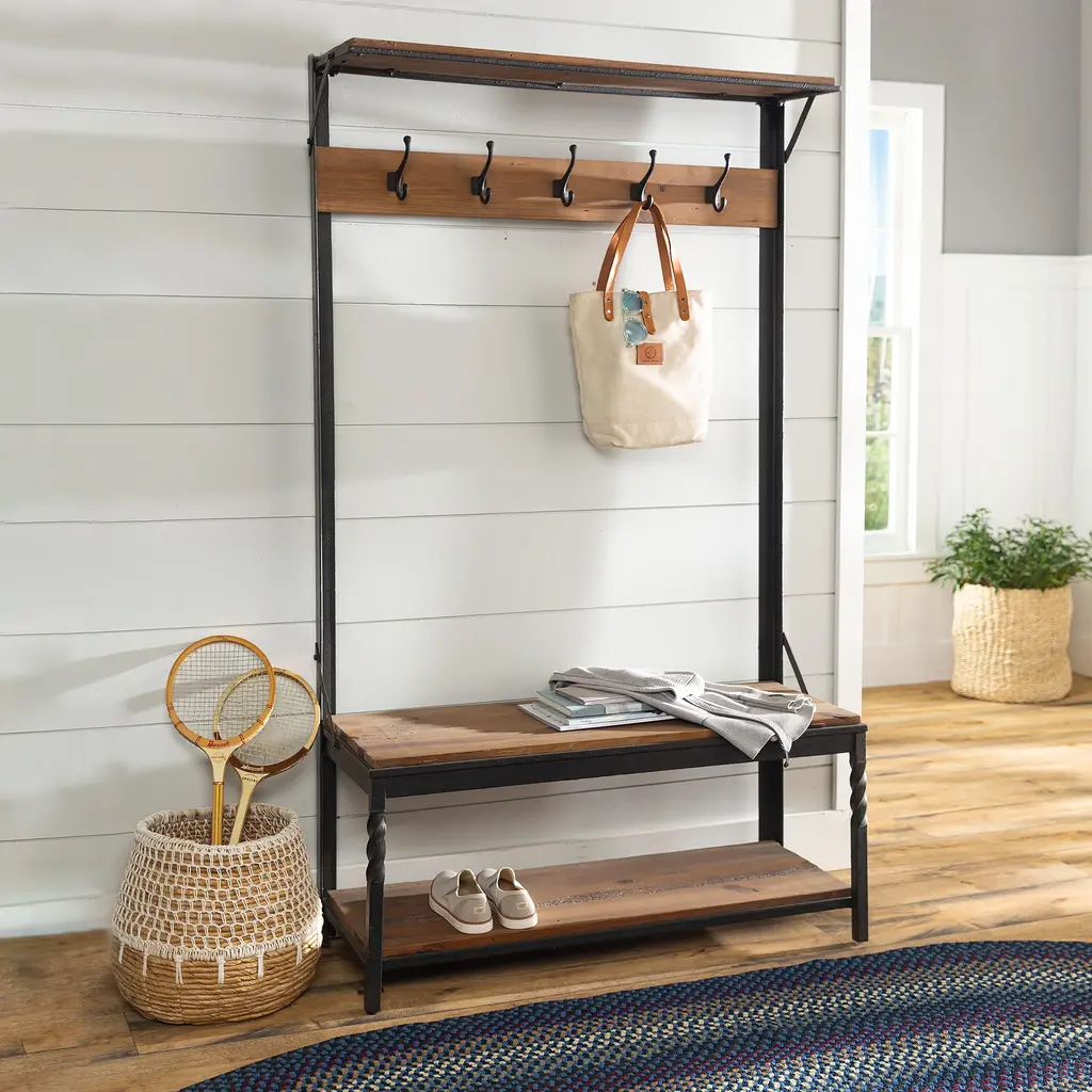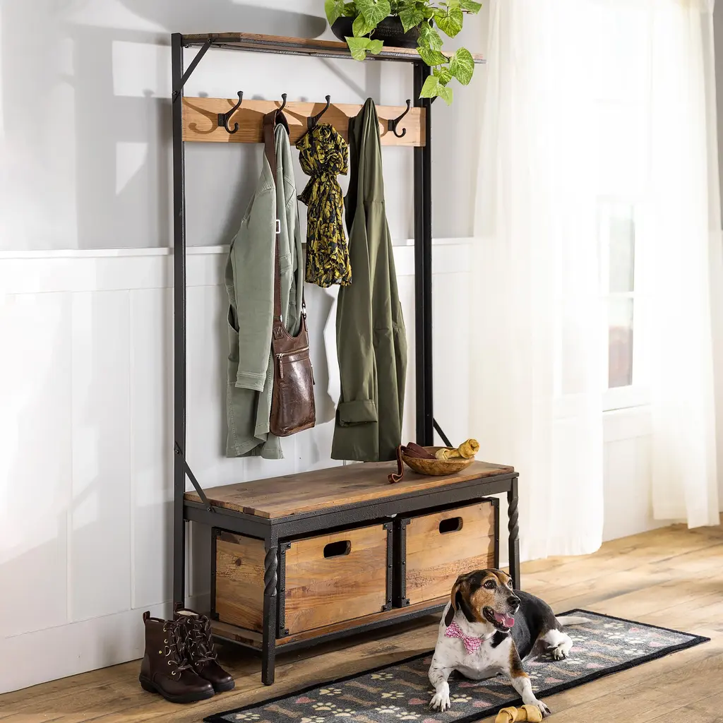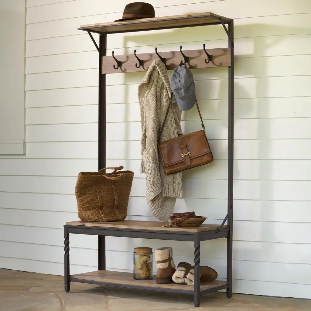 Bring style to your storage with our Deep Creek Coat Rack, a functional piece designed to save space and store plenty. All wood surfaces are reclaimed and rustic for a great look. The black wrought iron frame is solid, sturdy and stunning with legs that are nicely turned for an elegant look. Super-functional design features five double hooks, top storage shelf, generous seating area, plus a bottom shelf perfect for shoe and boot storage. You'll love the versatility, function and size of this attractive piece. Industrial-chic aesthetic blends well with farmhouse, classic or transitional styles. Easy assembly.