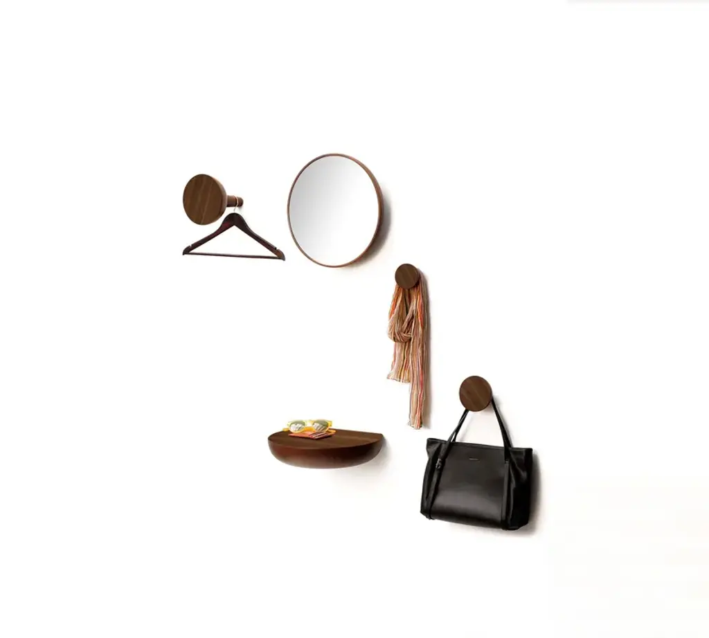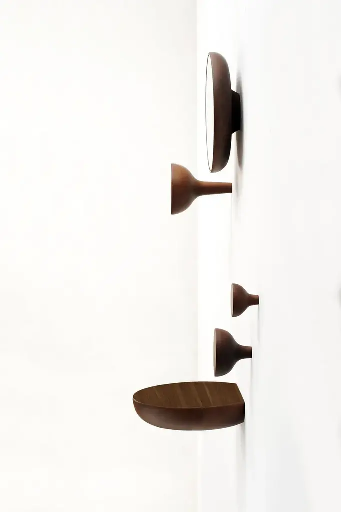 WELCOME is a wall-mounted wooden coat rack. It is one of the pieces of WELCOME modular system, consisting of a mirror, a shelf and hangers of differents sizes.Materials: natural solid walnut veneered wood.WELCOME | Coat rack S + M (WEN0000PSM)WELCOME | Coat rack L (WEN000PXL)