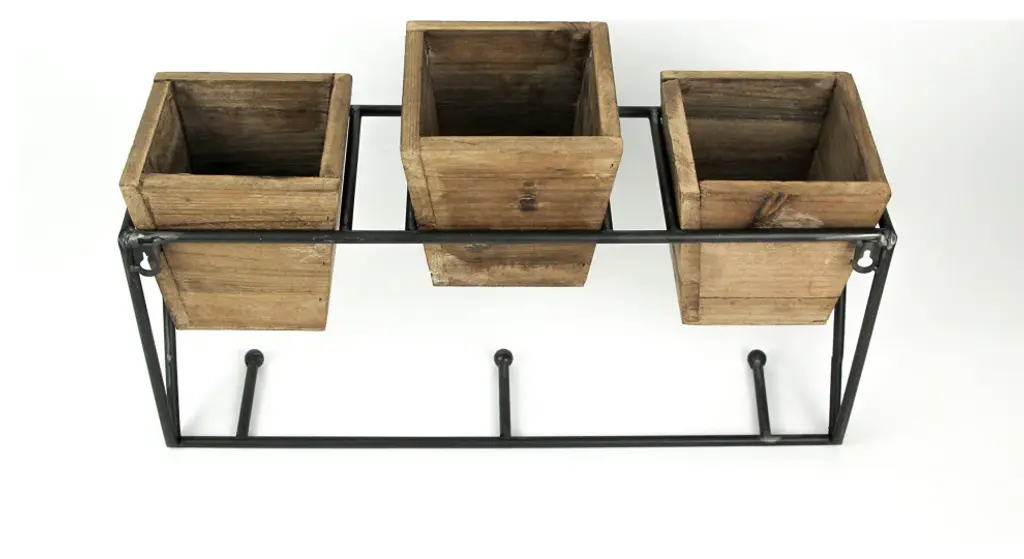 Wood And Wrought Iron Triple Planter Wall Hook Rack