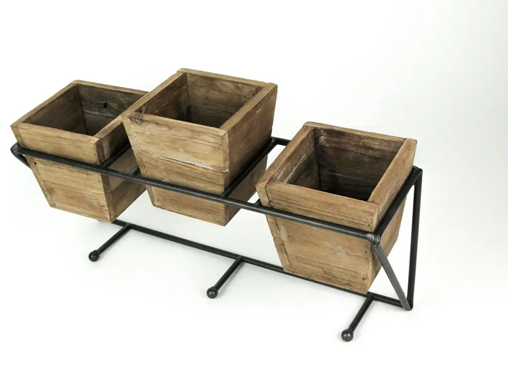OVERALL SIZE - 11.25 Inches High, 19.25 Inches Long, 4.75 Inches WideDURABLE MATERIAL - Crafted from Wrought Iron and WoodNATURAL FINISH - For A Great Country or Farmhouse LookEASY TO MOUNT - Using Keyhole Hangers on BackWONDERFUL GIFT - For Yourself or your Plant Loving FriendsGive your home a touch of vintage farmhouse flair and bring your plants to new decorative heights with this wall-mounted rack of hooks, featuring a trio of wooden planters. They look great with trailing plants, tall grasses, and colorful flowers and if you don''t have a green thumb, just arrange some silk greenery to bring a sense of nature into your home. The planters are constructed of wood, and the wall rack has a black enamel-finished wrought iron frame to secure them to your wall. The rack measures 11.25 inches high, 19.25 inches long, and 5.75 inches deep, and mounts easily to your wall, using the keyhole hangers on the back. The planters do not have a drainage hole.