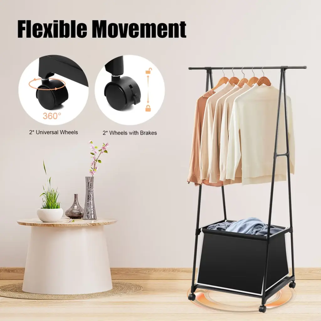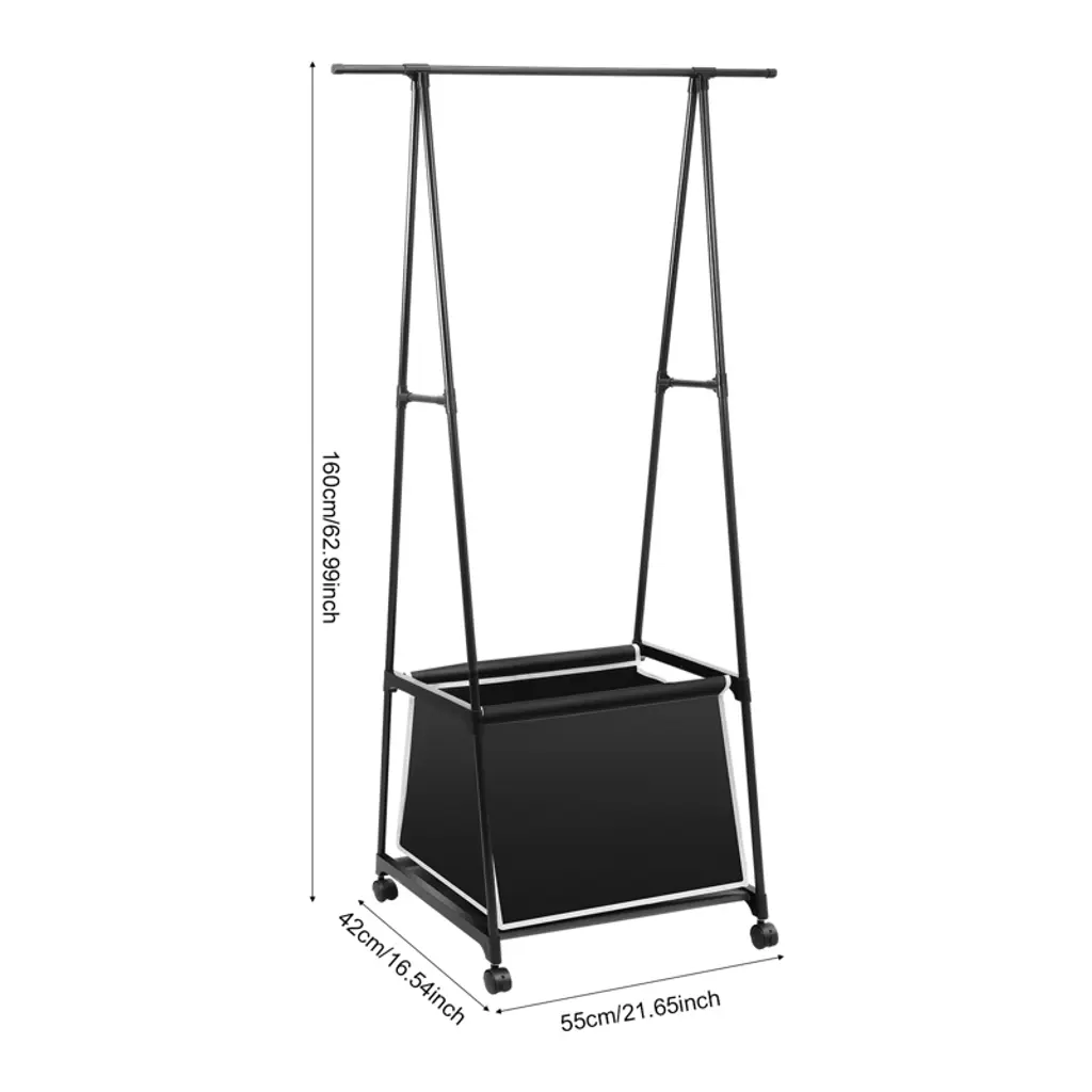 This versatile clothes rack masterfully combines practicality with modern style. Its sturdy steel construction and stable triangular frame ensure durability, while the versatile design features a hanging rod and a waterproof, non-woven fabric basket for ample storage. Equipped with four universal wheels (two with brakes), it offers effortless mobility and flexibility, making it easy to move and position as needed. With a sleek, clean-lined aesthetic, this rack is a perfect storage solution for bedrooms, laundry rooms, or dorms, enhancing your space while keeping it organized.