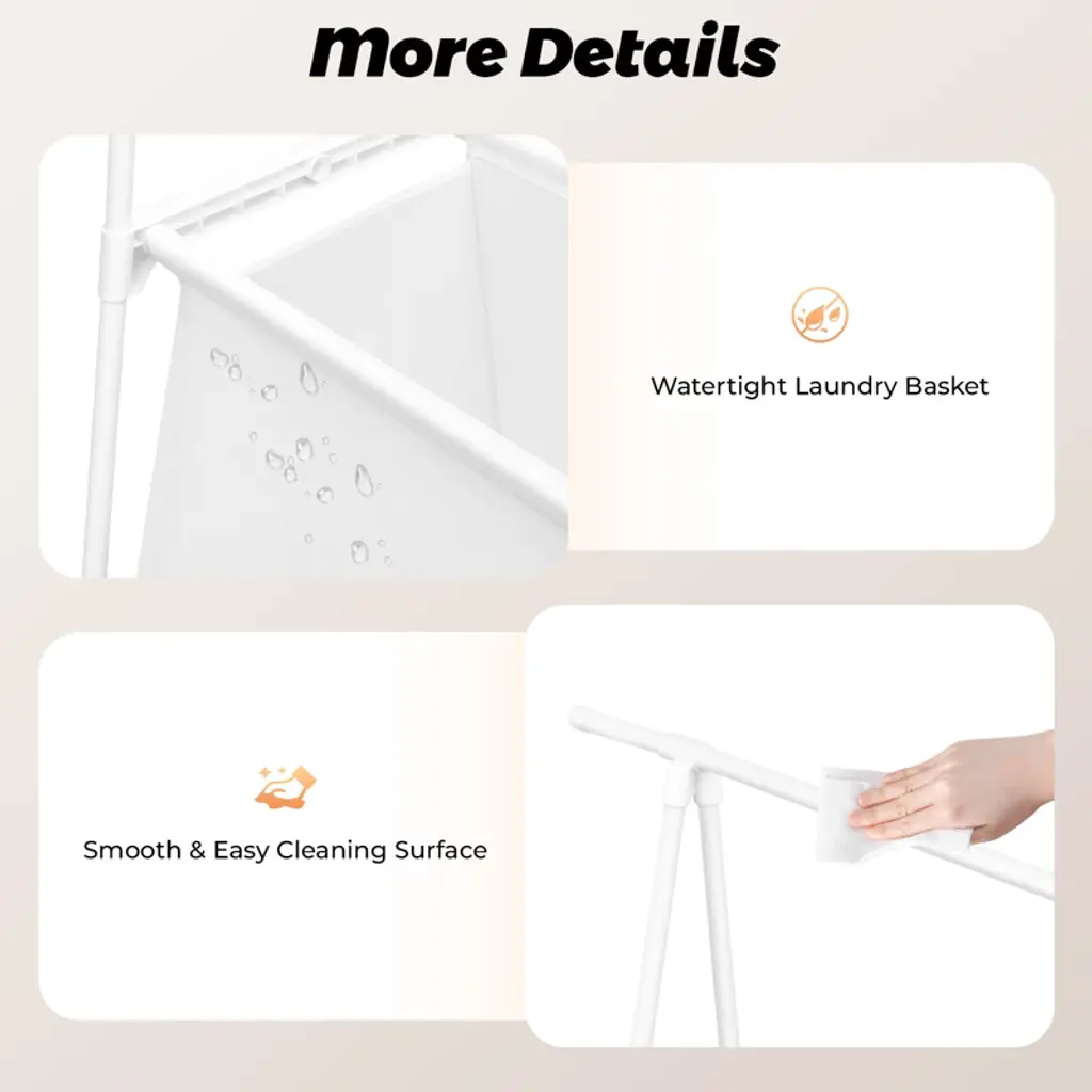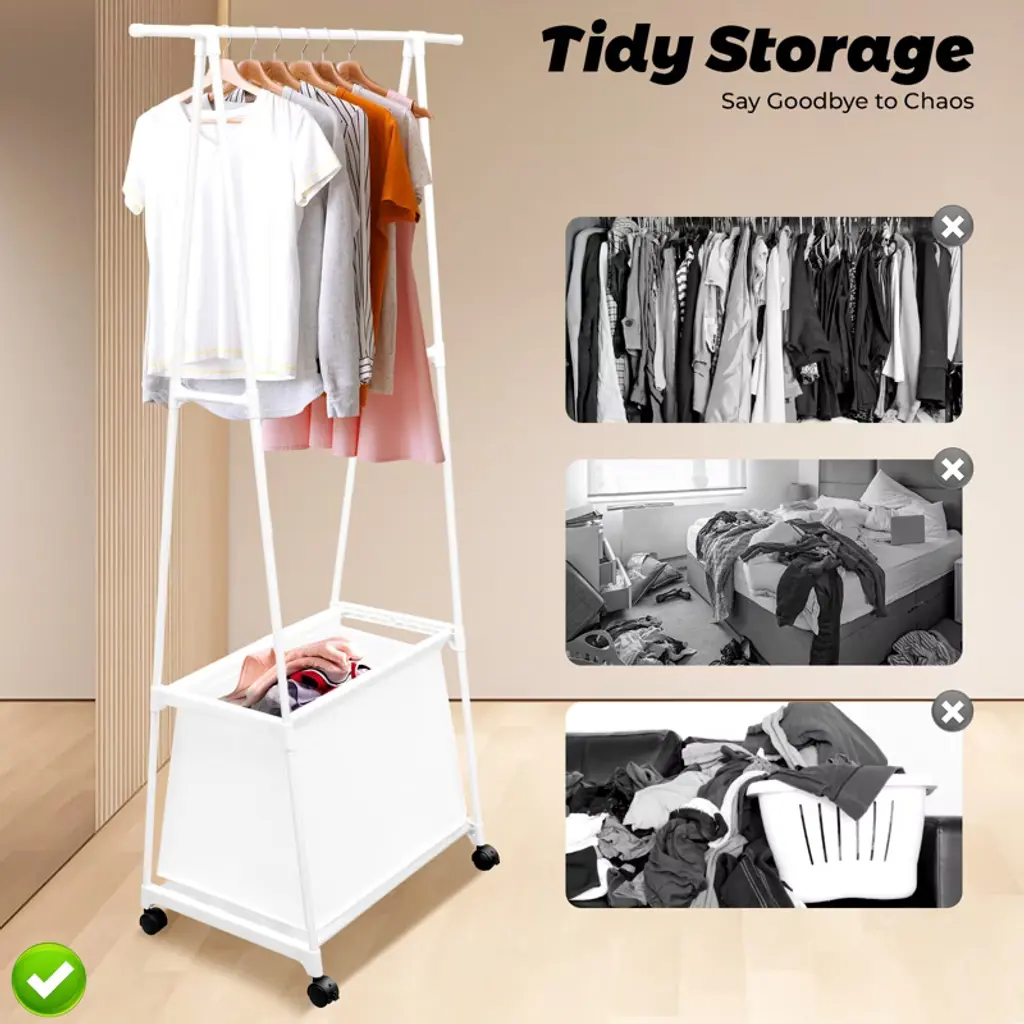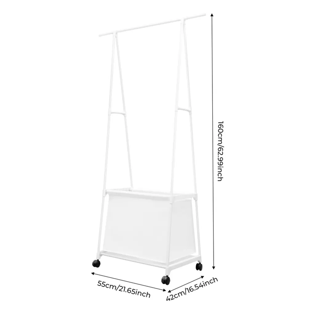 This versatile clothes rack masterfully combines practicality with modern style. Its sturdy steel construction and stable triangular frame ensure durability, while the versatile design features a hanging rod and a waterproof, non-woven fabric basket for ample storage. Equipped with four universal wheels (two with brakes), it offers effortless mobility and flexibility, making it easy to move and position as needed. With a sleek, clean-lined aesthetic, this rack is a perfect storage solution for bedrooms, laundry rooms, or dorms, enhancing your space while keeping it organized.