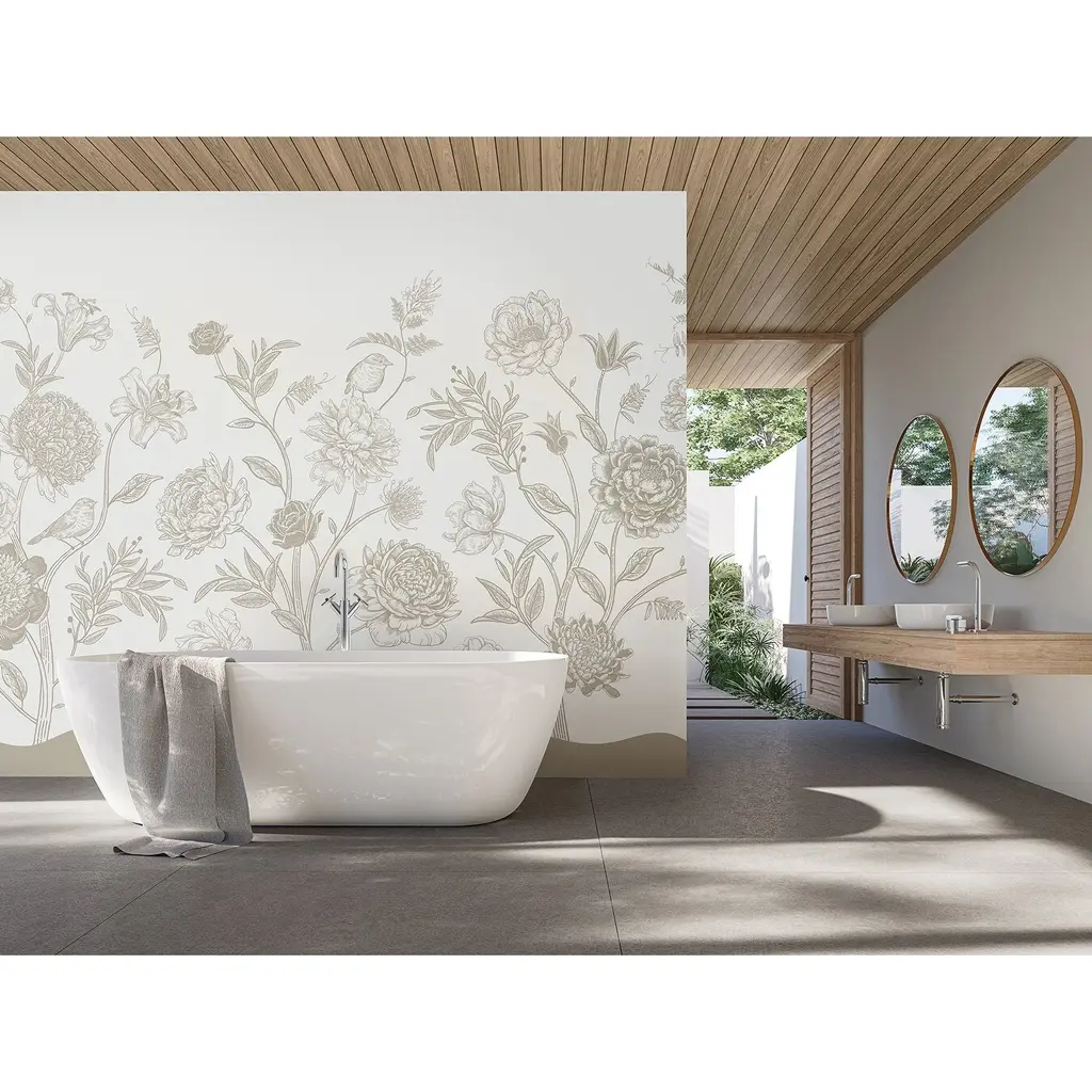 The timeless appeal of chinoiserie florals is given more playful, illustrative stylings in this wall mural. Plump birds perch within the winding rosebush stems. Seen here inked in beige against white. Jacobean Rose Trail Neutral Wall Mural comes on 6 panels, measuring 118-in by 94-in when fully assembled. An illustrative and whimsical take on refined chinoiserie murals. Printed on non woven material. Paste Not Included. Measures 9-ft 10-in wide by 7-ft 10-in tall when assembled. Comes in 6 panels.