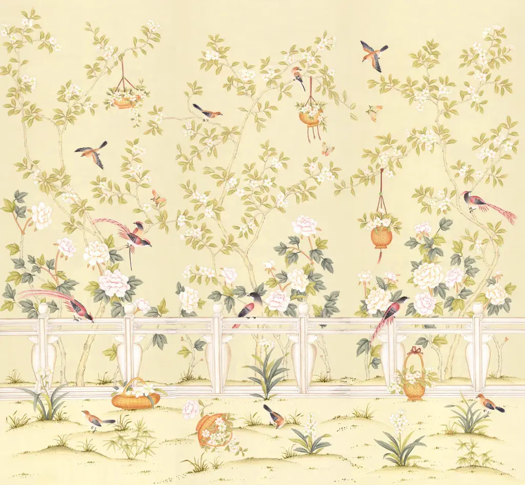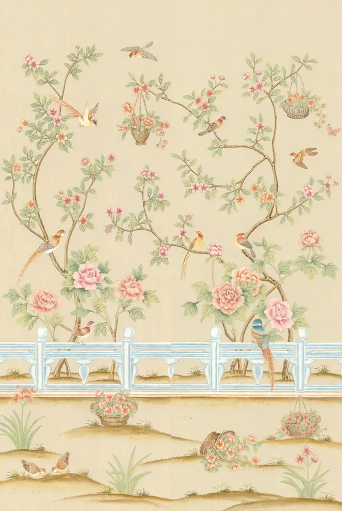 Chinoiserie with delicate flowers and beautiful birds in a ornately fenced garden. No. of Panels 3 - PW (Panel Width) 36 - DH (Design Height) 96
