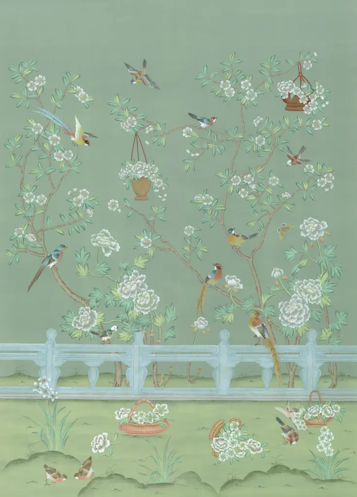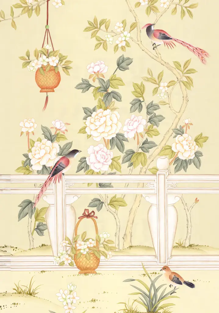 Chinoiserie with delicate flowers and beautiful birds in a ornately fenced garden. No. of Panels 2 - PW (Panel Width) 36 - DH (Design Height) 88