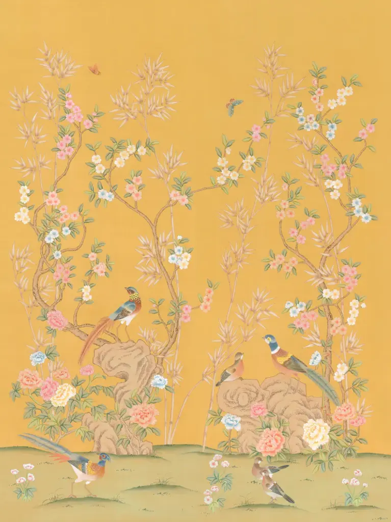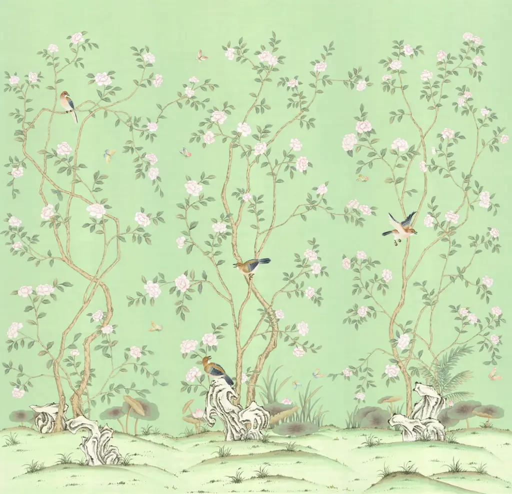 Chinoiserie Wall Mural Lantilly Triptych, Emerald