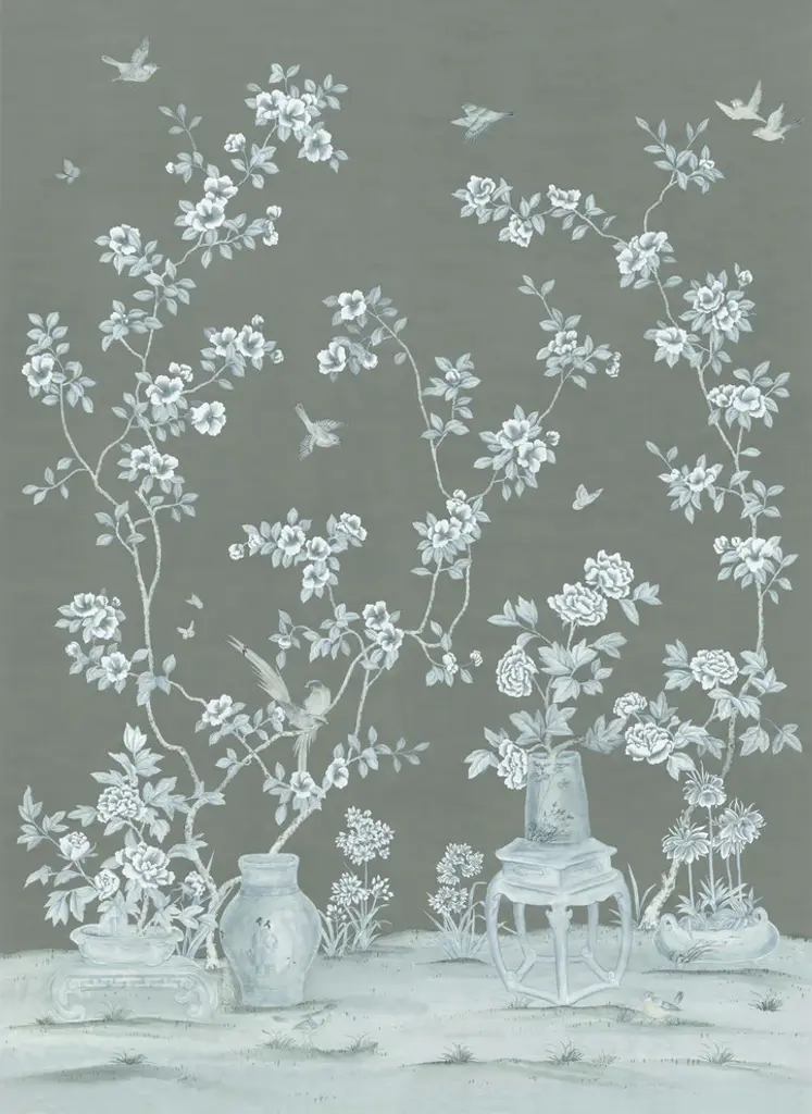 Chinoiserie with delicate camellias and peonies and beautiful Chinese porcelain vases. No. of Panels 2 - PW (Panel Width) 36 - DH (Design Height) 96