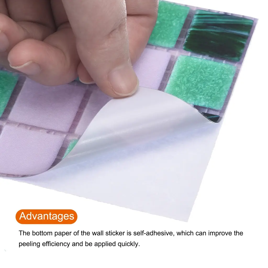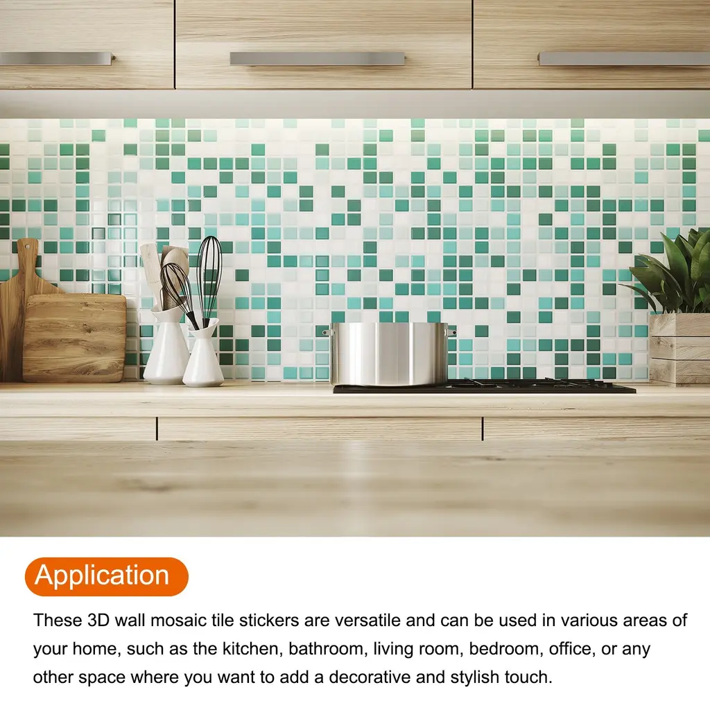 What is this?These 3D wall mosaic tile stickers are versatile and can be used in various areas of your home, such as the kitchen, bathroom, living room, bedroom, office, or any other space where you want to add a decorative and stylish touch.What will I get?The wall mosaic tile stickers, we provide here, is in the size of:Each Sheet Size: 10 x 10cm/3.94 x 3.94 inch ( (L*W))Type: Self-AdhesiveMaterial: PVC Bright FilmColor: Multicolor MosaicIn the package of: 1 Set x Mosaic Tile Stickers, 10pcs in totalAre there any advantages of the product?These tile stickers are waterproof and heat-resistant, making them suitable for use in areas prone to moisture or high temperatures.With their smooth surface, these tile stickers are easy to clean and maintain. Simply wipe them down with a damp cloth to remove any dirt.How to use it?Steps of installation: 1. Clean the wall or object surface; 2. Position the place where you want to paste it; 3. Tear off the adhesive protective film of the mosaic sticker and paste it at the marked location.What should I notice?These tile stickers work best on smooth, flat surfaces. Avoid applying them on textured walls or surfaces, as it may affect the overall appearance and adhesion.
