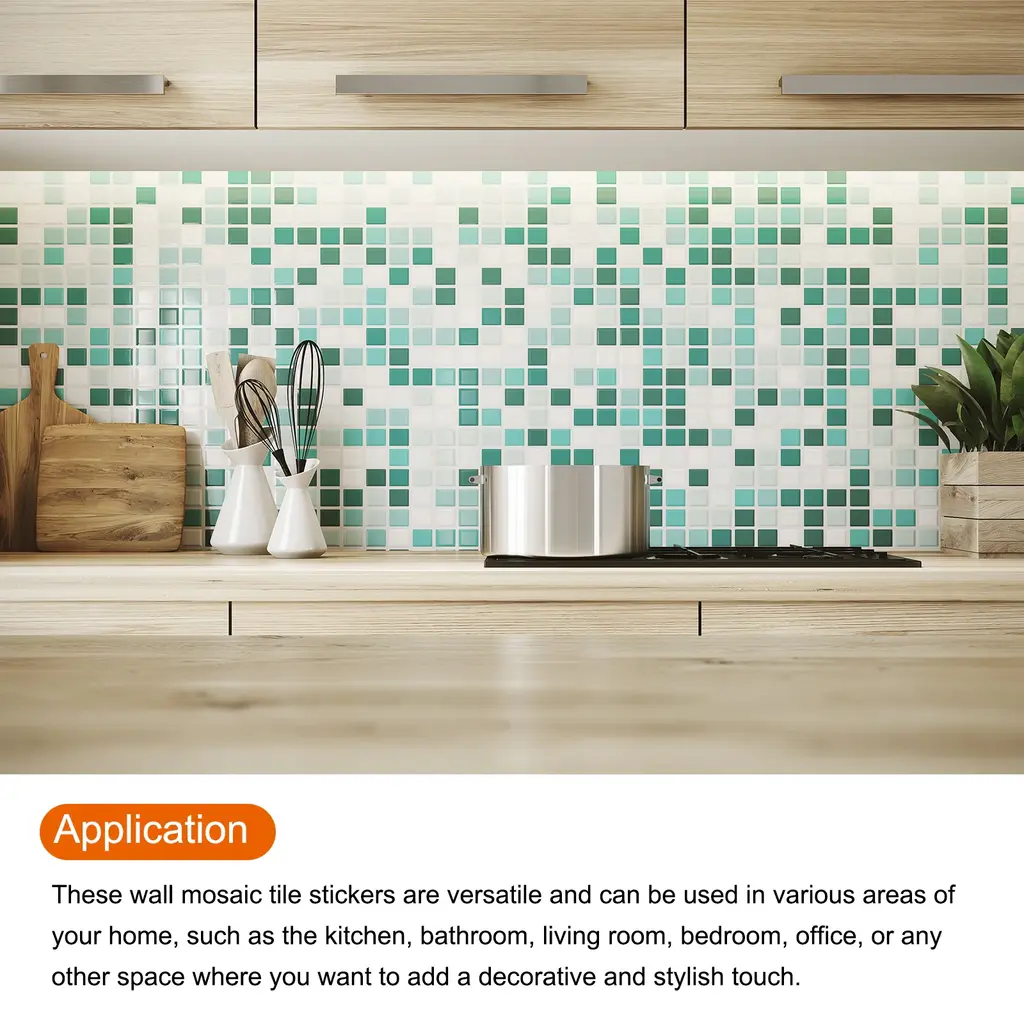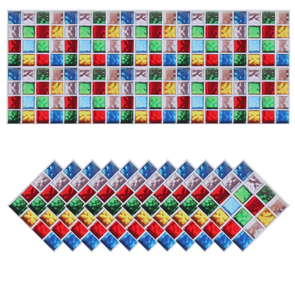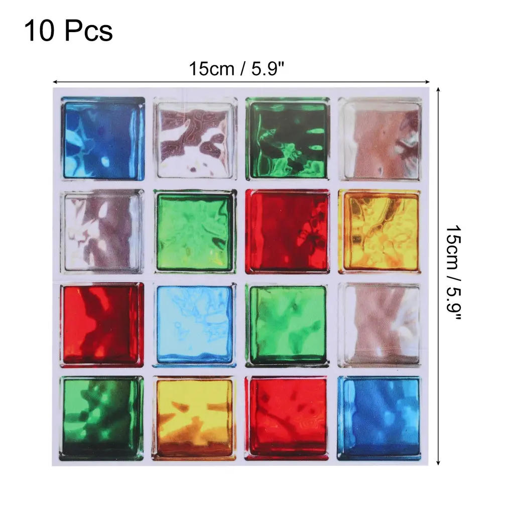 What is this?These bright wall mosaic tile stickers are versatile and can be used in various areas of your home, such as the kitchen, bathroom, living room, bedroom, office, or any other space where you want to add a decorative and stylish touch.What will I get?The wall mosaic tile stickers, we provide here, is in the size of:Each Sheet Size: 15 x 15cm/5.9 x 5.9 inch (L*W)Type: Self-AdhesiveMaterial: PVC Bright FilmColor: Multicolor MosaicIn the package of: 1 Set x Mosaic Tile Stickers, 10pcs in totalAre there any advantages of the product?Our bathroom or kitchen tile stickers are waterproof and heat-resistant, and have a strong back adhesive, you can stick it to most types of tiles or any flat surface, such as walls, glass, and tables, and worry about falling off.With their smooth surface and never fade the color of these mosaics, these tile stickers are easy to clean and maintain. Simply wipe them down with a damp cloth to remove any dirt.How to use it?Steps of installation: 1. Clean the wall or object surface; 2. Position the place where you want to paste it; 3. Tear off the adhesive protective film of the mosaic sticker and paste it at the marked location.What should I notice?These tile stickers work best on smooth, flat surfaces. Avoid applying them on textured walls or surfaces, as it may affect the overall appearance and adhesion.