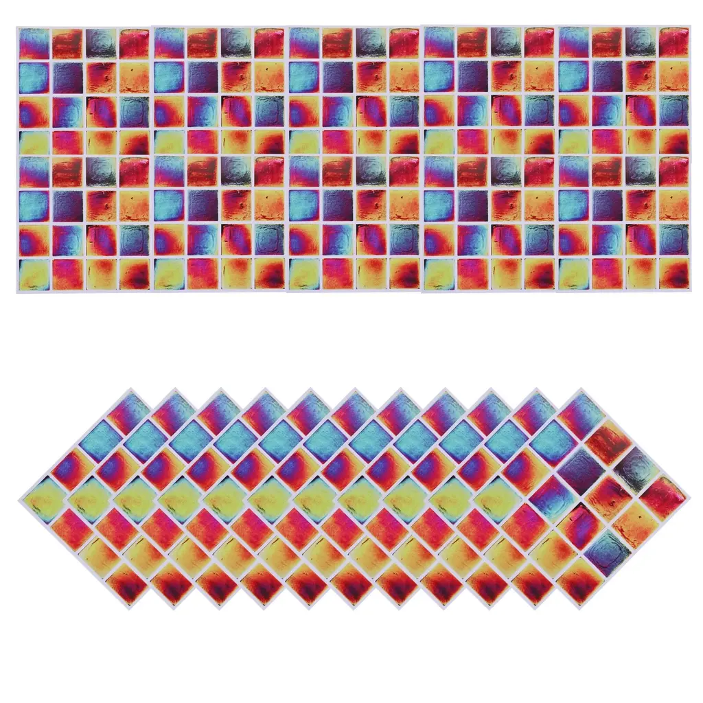 What is this?These bright wall mosaic tile stickers are versatile and can be used in various areas of your home, such as the kitchen, bathroom, living room, bedroom, office, or any other space where you want to add a decorative and stylish touch.What will I get?The wall mosaic tile stickers, we provide here, is in the size of:Each Sheet Size: 15 x 15cm/5.9 x 5.9 inch (L*W)Type: Self-AdhesiveMaterial: PVC Bright FilmColor: Multicolor MosaicIn the package of: 1 Set x Mosaic Tile Stickers, 10pcs in totalAre there any advantages of the product?Our bathroom or kitchen tile stickers are waterproof and heat-resistant, and have a strong back adhesive, you can stick it to most types of tiles or any flat surface, such as walls, glass, and tables, and worry about falling off.With their smooth surface and never fade the color of these mosaics, these tile stickers are easy to clean and maintain. Simply wipe them down with a damp cloth to remove any dirt.How to use it?Steps of installation: 1. Clean the wall or object surface; 2. Position the place where you want to paste it; 3. Tear off the adhesive protective film of the mosaic sticker and paste it at the marked location.What should I notice?These tile stickers work best on smooth, flat surfaces. Avoid applying them on textured walls or surfaces, as it may affect the overall appearance and adhesion.