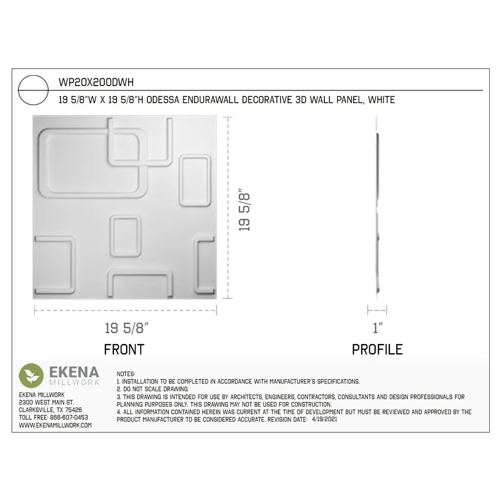19 5/8"w X 19 5/8"h Odessa Endurawall Decorative 3D Wall Panel, White - 20-Pack (53.49 Sq. Ft.)