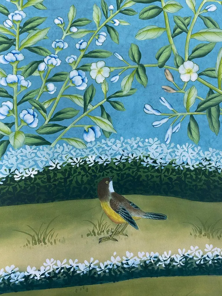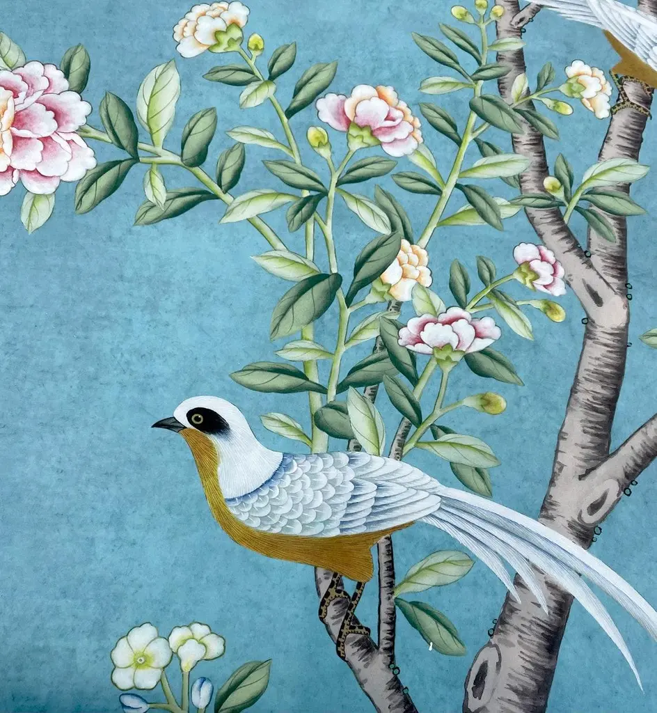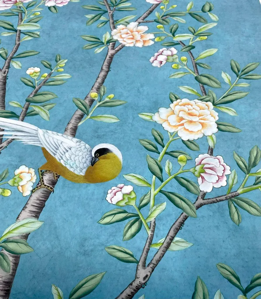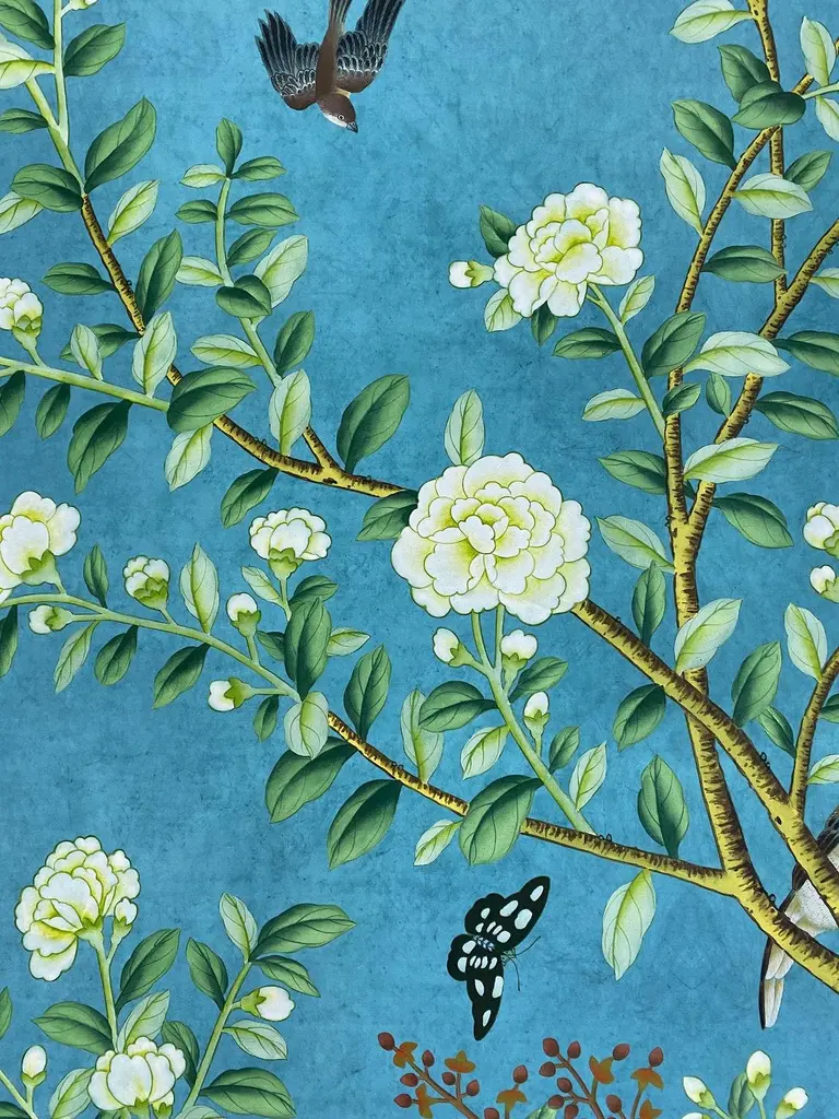 Wall artwork: Chinoiserie Flowers in a over-painted pattern colorway printed on blue ground, . These prints of chinoiserie birds and flowers will look beautiful in your home. Material: Tea wallpaper ( hand-mounted handicrafts). Ground color: antiqued style Handicrafts: Printed Unframed panel Size: 20" *40"/panel Wallpaper price: List price is for a pair of two panels, no frame