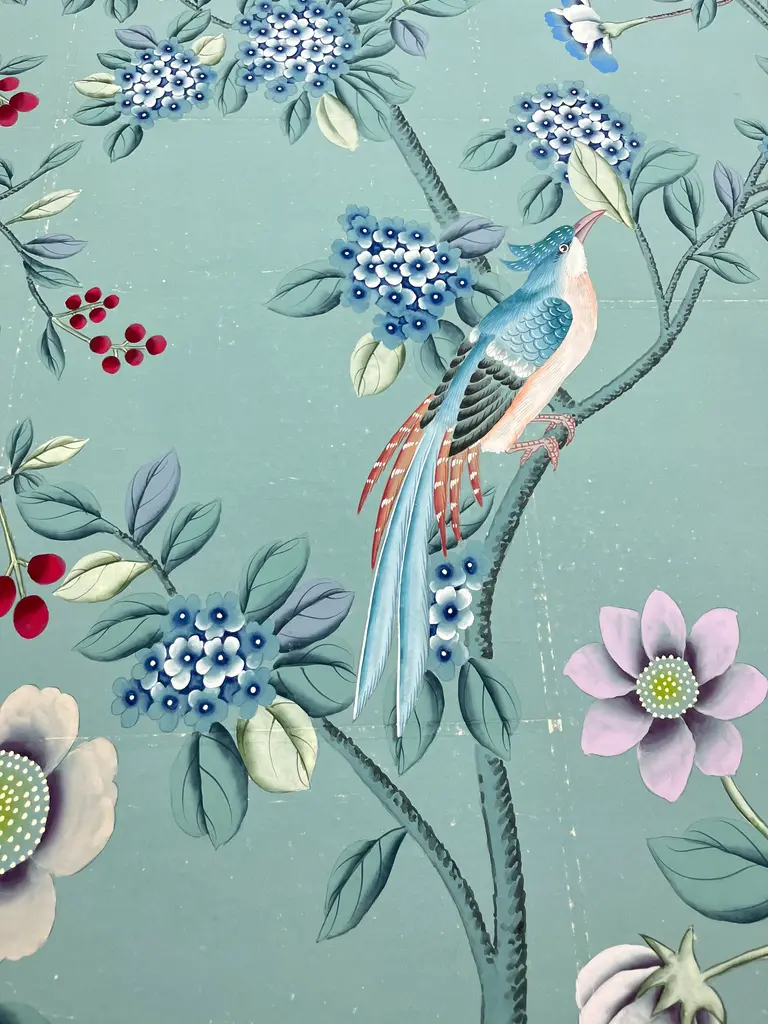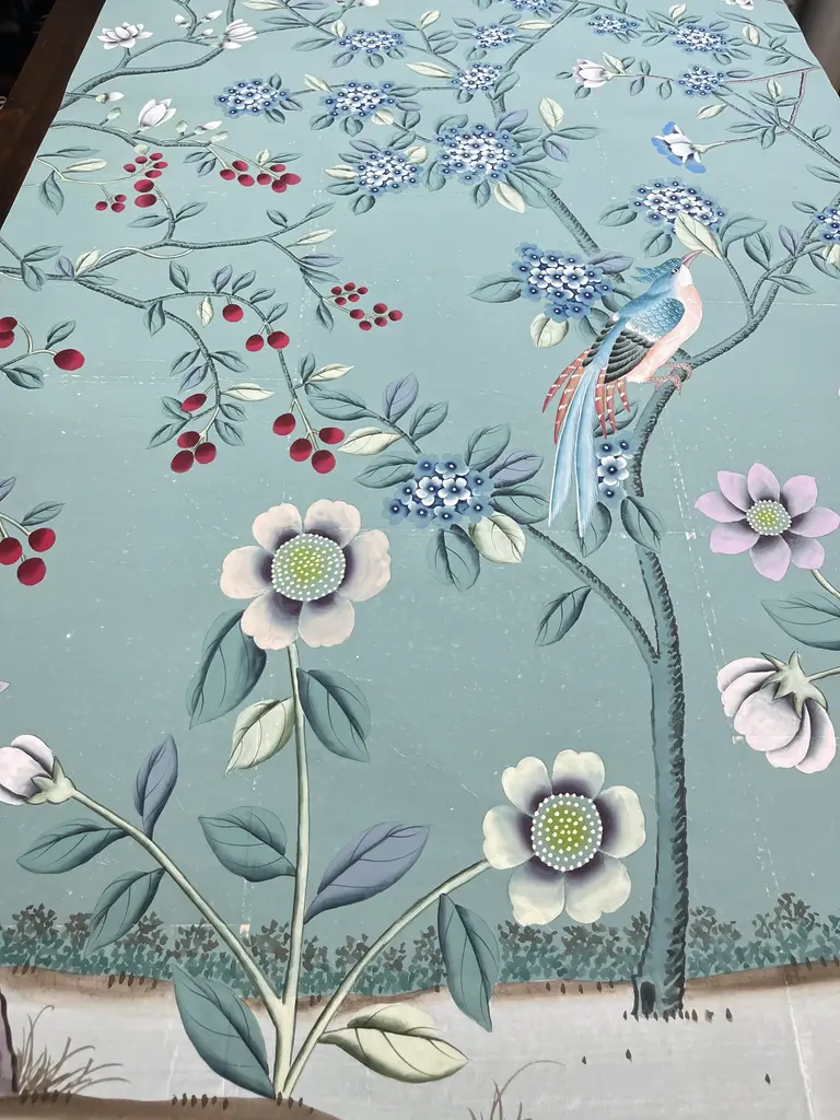 21st Century Chinoiserie Mural Hand Painted Wallpaper Panels On Blue Tea Paper Panel - 4 Panels