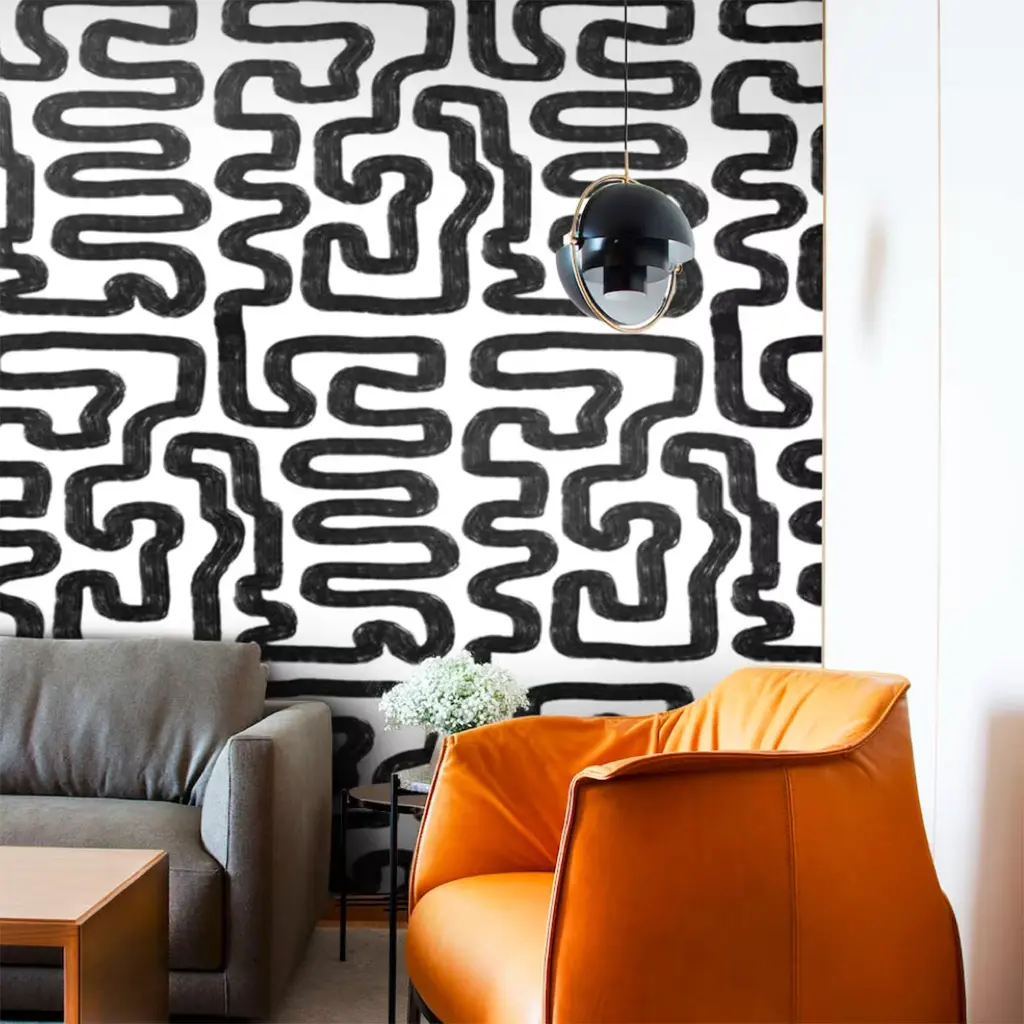 This wallpaper is made from 100% ecological paper, printed with vegan water-based inks, and free of chemicals and solvents. Each package contains eight sheets. Inspired by 18th-century English tradition and printed in Italy, it's perfect for walls, shelves, and furniture. The abstract black brush stroke print, set against a white background, features a timeless pattern that is delicate and sophisticated. Each sheet measures 27.5x39.4 inches/70x100 cm, covering a total area of 5 MQ.